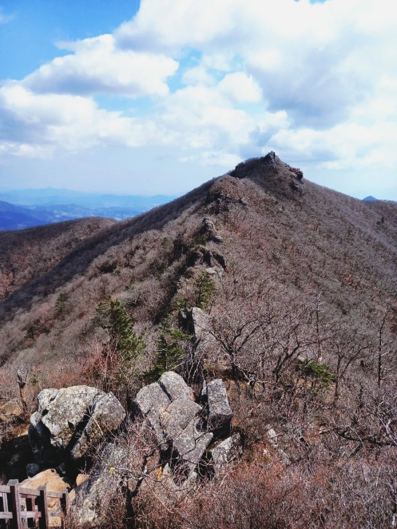 신선대에서 백운산 정상 상봉 가는 길은 약 500m 정도 되는데, 완만해서 걷기가 좋다. 신선대에서 상봉을 바라볼 때는 깎아지른 바위들이 쭉 이어서 솟아 있어서 저길 또 가야 하나 싶었는데, 그 바위 옆으로 길이 나 있다.