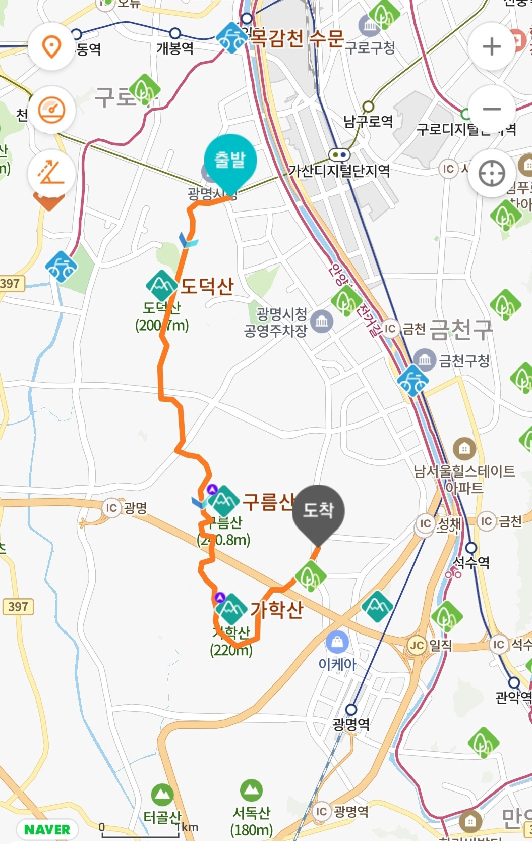 광명 도덕산+구름산+가학산 산행 기록 : 총 11km, 5시간 소요(휴식, 점심 시간 포함)