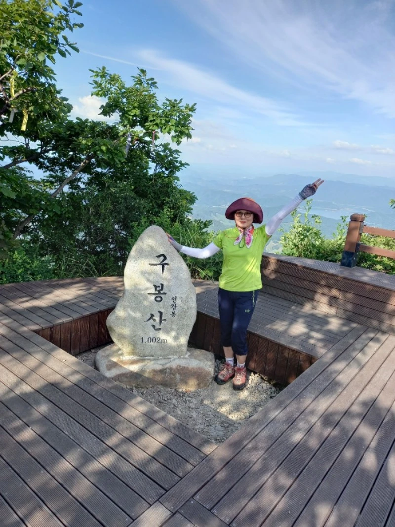 구봉산 정상에서 100대 명산 53번째 인증숏 찍는다. 나를 기다려주며 끝까지 함께 한 분이 오이와 방울토마토를 주시기에 앉아서 먹고 넋을 잃고 풍경 조망을 한다. 환상의 세계가 따로 없다.