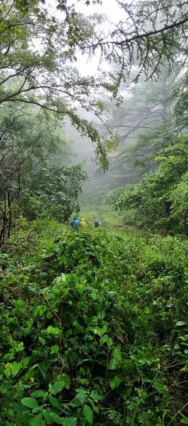 겨우 연인산 팀과 만날 수 있는 명지산 삼거리 도착해서 싸간 김밥을 우중에 서서 먹는다. 조금 이르긴 하지만 아침을 먹고 나와서 휴게소에서 쉴 때 뭘 안 먹었더니 조금 배가 고프다. 폰 시계를 보니 11시 30분이라 딱 배고플 때다. 점심 간단하게 먹고 부지런히 걷는다. 빗방울이 점점 굵어지면서 운무가 짙어지고 바람도 조금씩 세게 분다.