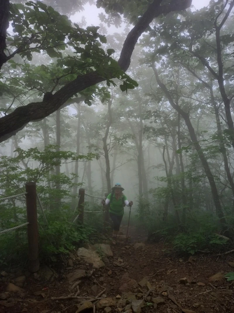 조망은 거의 없다. 운무 속이라 그런가 했는데 어느 분이 날씨 좋아도 그렇단다. 초록숲길만 계속 이어진다. 날씨가 습해 땀은 많이 나도 시원하다.