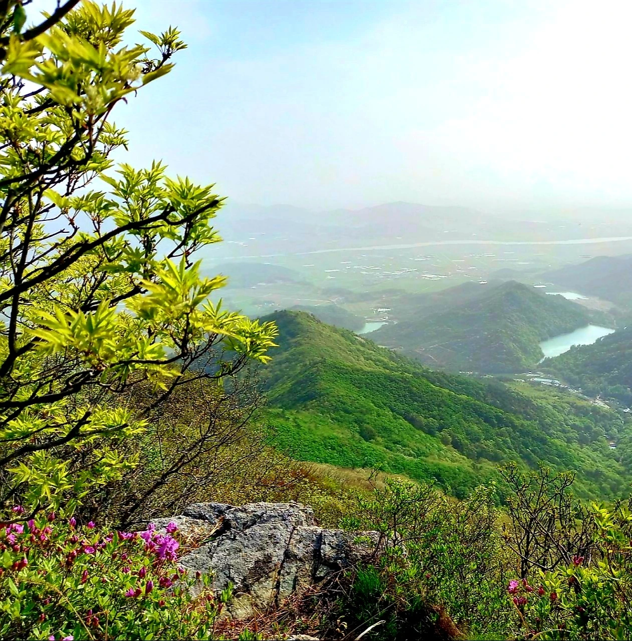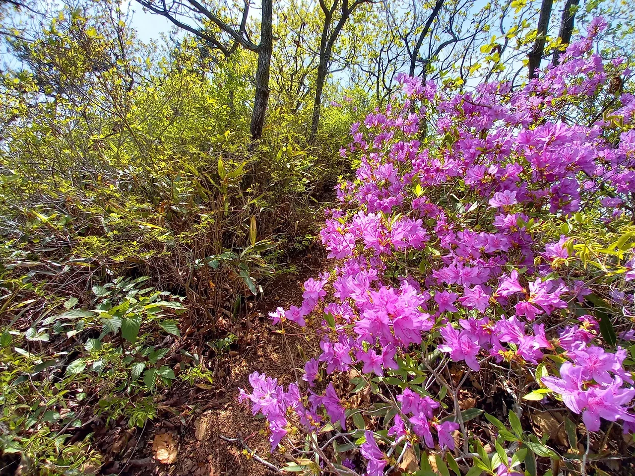 암릉구간 지나면 철쭉꽃길에 대숲길이 예쁘다. 주변 조망도 좋다. 약간의 미세먼지가 있지만 이 정도면 풍경이 좋은 편이다. 산마루금과 저수지와 암릉들이 어우러져 멋진 풍광을 자랑한다.