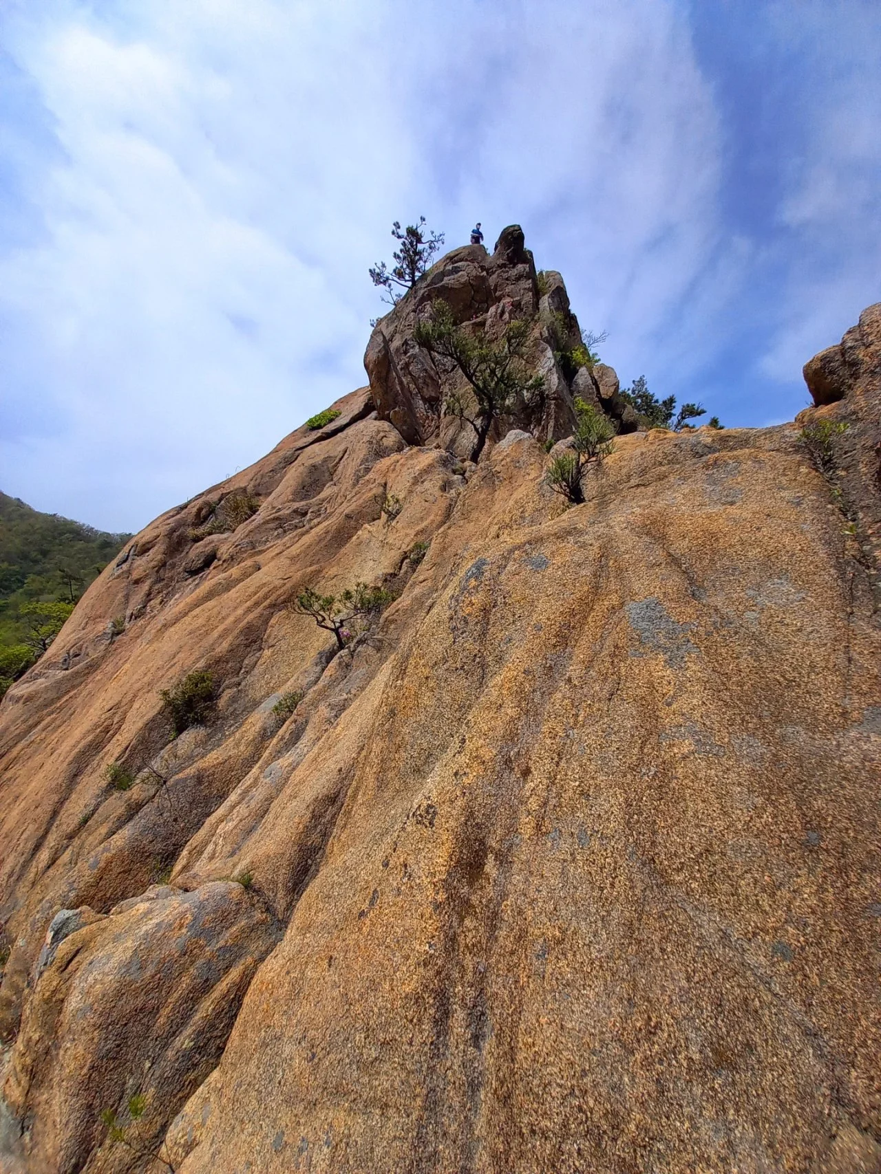 가파른 암릉 위에 남산우 님 모습이 보인다. 햐! 무섭지도 않나 보다. 나는 우회구간이 있을 때는 돌아서 오르고 그렇지 않을 때는 암릉을 탄다. 그래도 아찔하다.