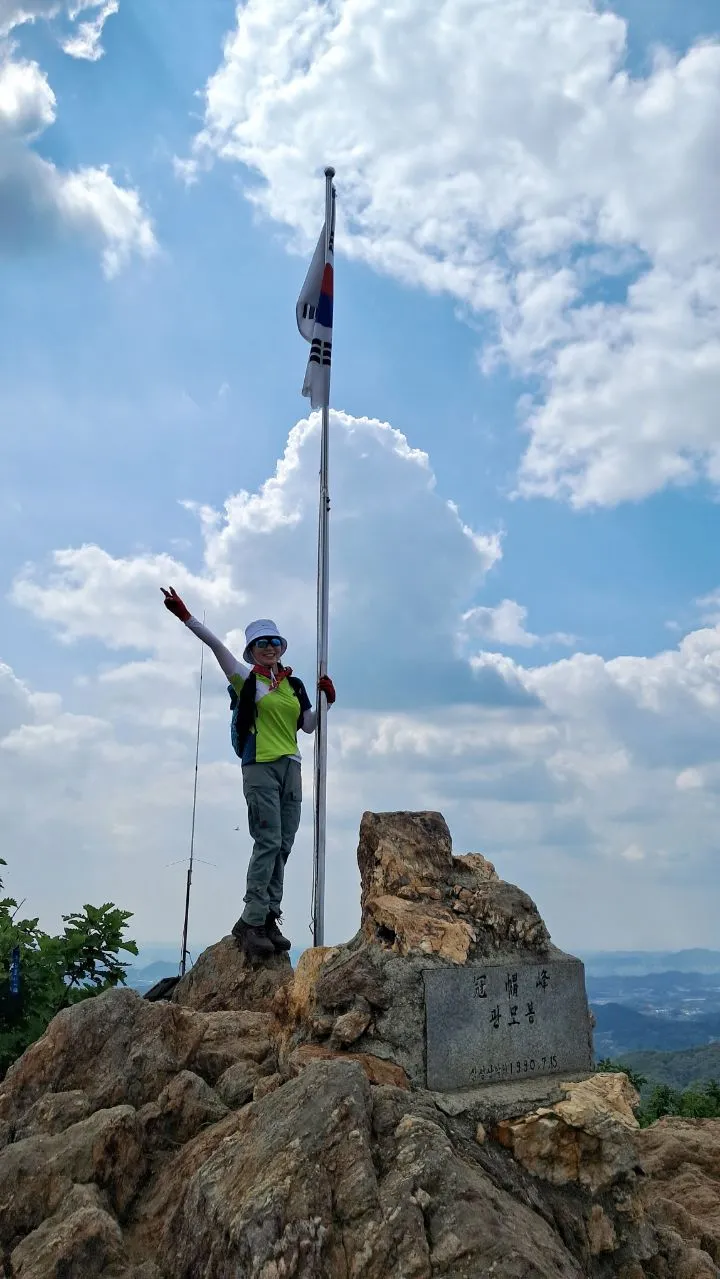암릉 위에 우뚝 솟은 깃대봉이 인기 스타다. 깃대봉을 애인인 양 붙들고 선다.