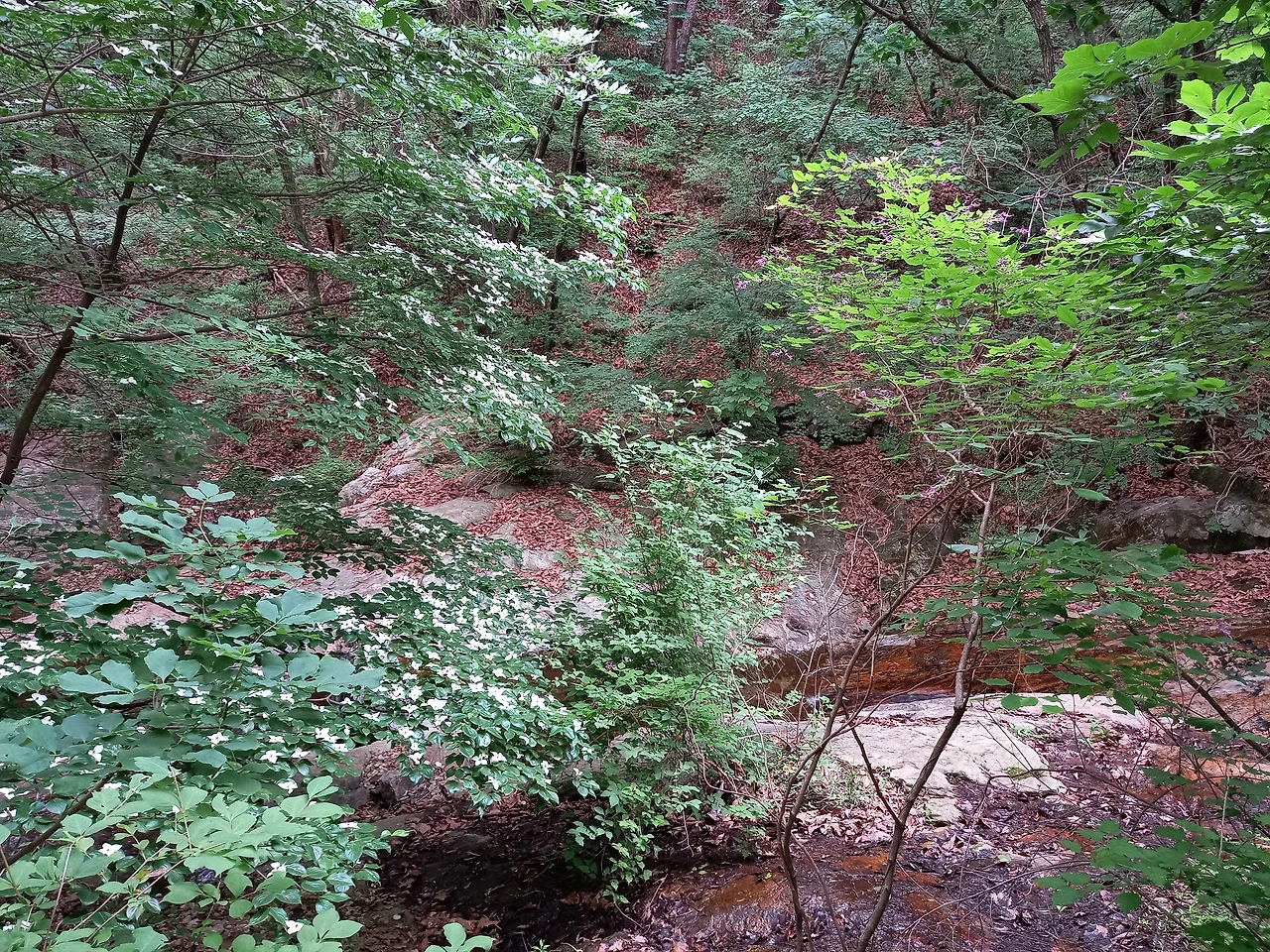 거북바위 지나 계곡물이 흐르는데 선녀폭포까지 거의 다온 듯한데 길이 너덜길 바위라 안 오르고 그냥 내려온다. 비가 살짝 내렸지만 미끄러울 수도 있어서다. 장소를 알았으니 다음 기회로 남겨둔다.