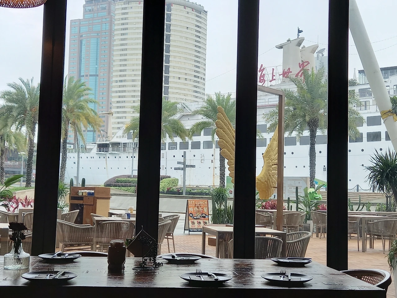 연못과 배 건물을 배경으로 사진을 찍는다. 한 바퀴 빙 돌아서 울 딸이 황금날개 포토존 장식이 되어있는 타코야끼 전문점 안으로 들어간다.
