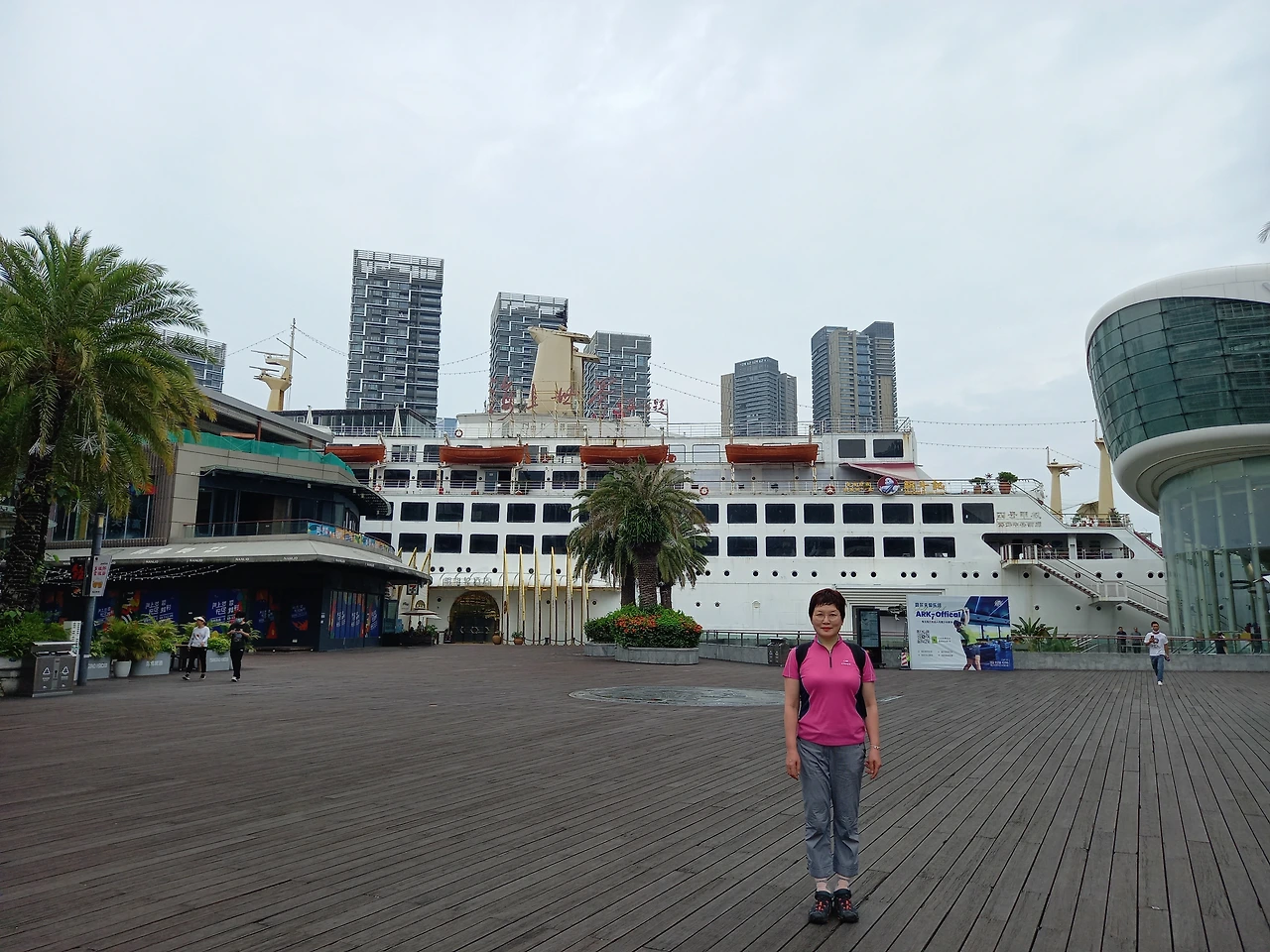 울 딸이 배 모양의 건물 《해상세계》를 가리킨다.