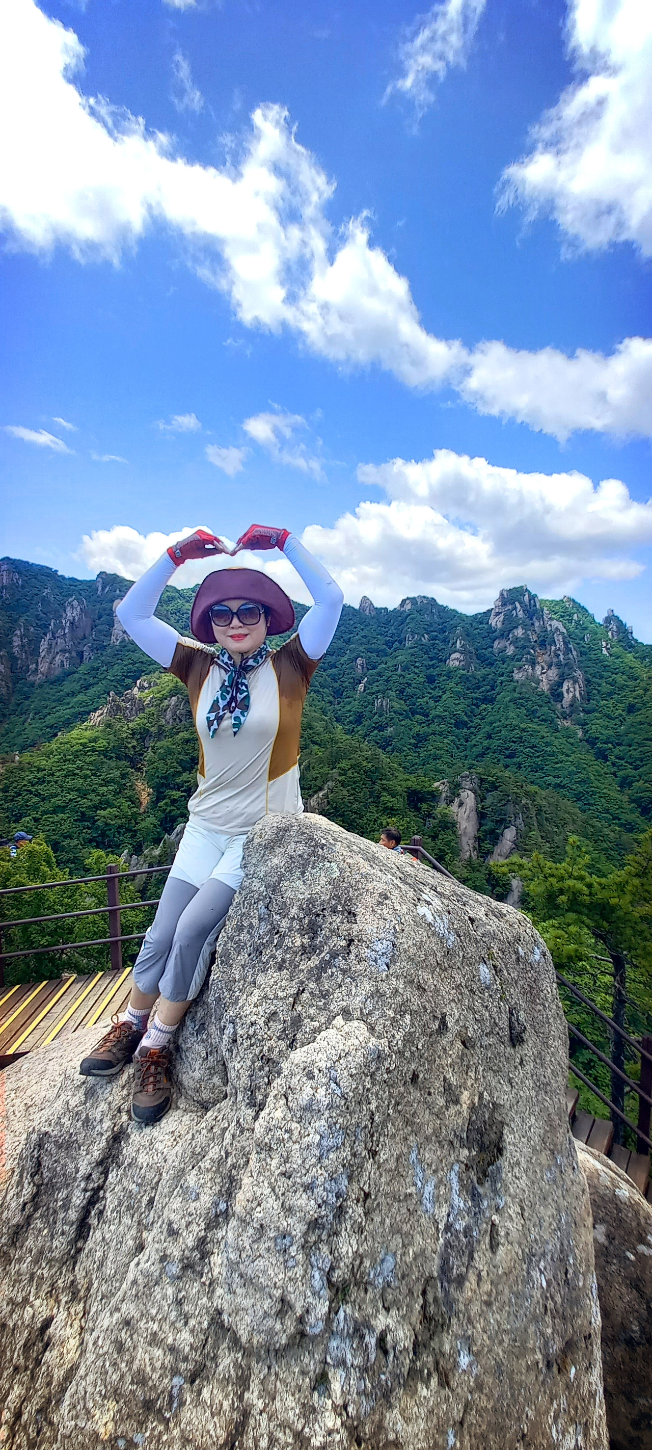 여자의 깊은 곳을 닮았다는 여심폭포와 전망대에서 사진을 찍고, 약간의 간식을 먹고 쉬어간다. 오전 11시 20분부터 오르기 시작해서 시간이 거의 12시가 다 되어가기에 점심식사를 하면 좋겠다 싶었지만 등선대 오르고 하산할 때 먹을 거란다.