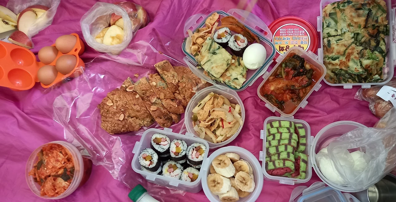 각자 싸 온 점심을 펼쳐 놓으니 진수성찬이 따로 없다. 부침개, 빵, 김밥, 조각 케이크, 라면, 어묵국, 어묵볶음, 삶은 계란, 사과. 바나나, 배추김치, 갓김치 등 아주 푸짐하다. 고대길님 표 열나짬뽕과 발자취님 표 어묵라면은 특별식이다. 약 1시간 정도 점심 식사를 한다. 커피까지 타서 마시니 우리가 바로 신선, 선녀구나 싶다.