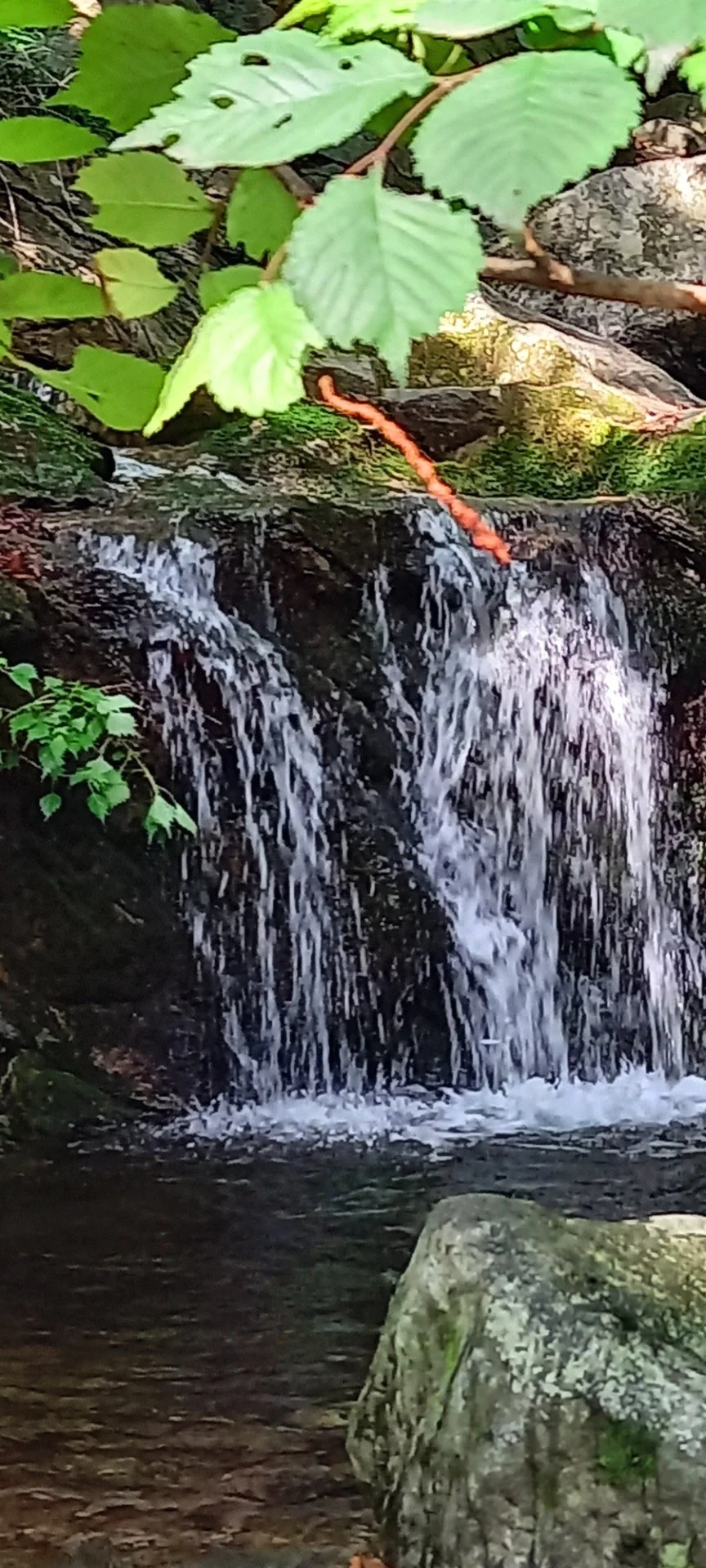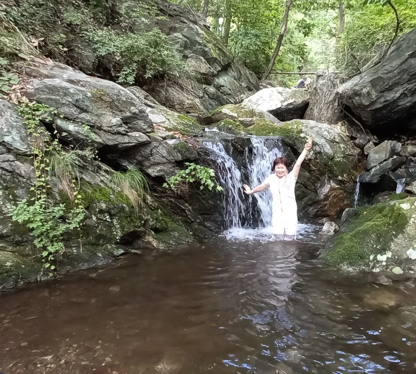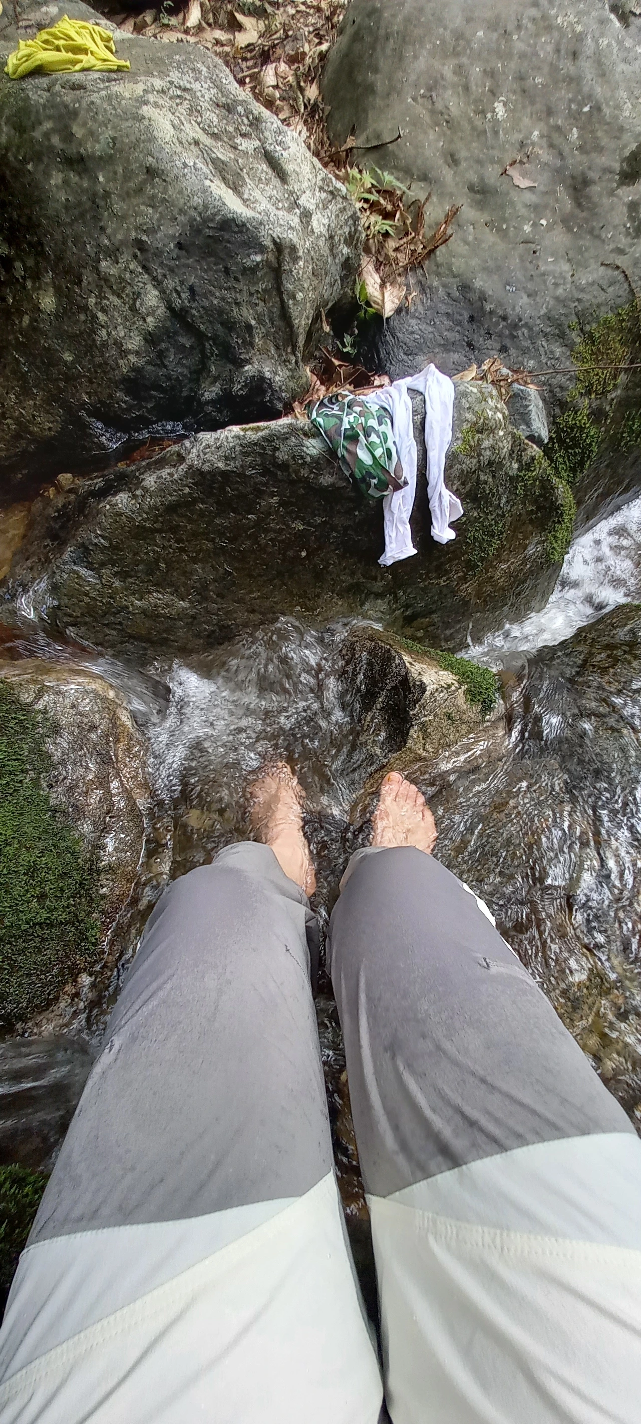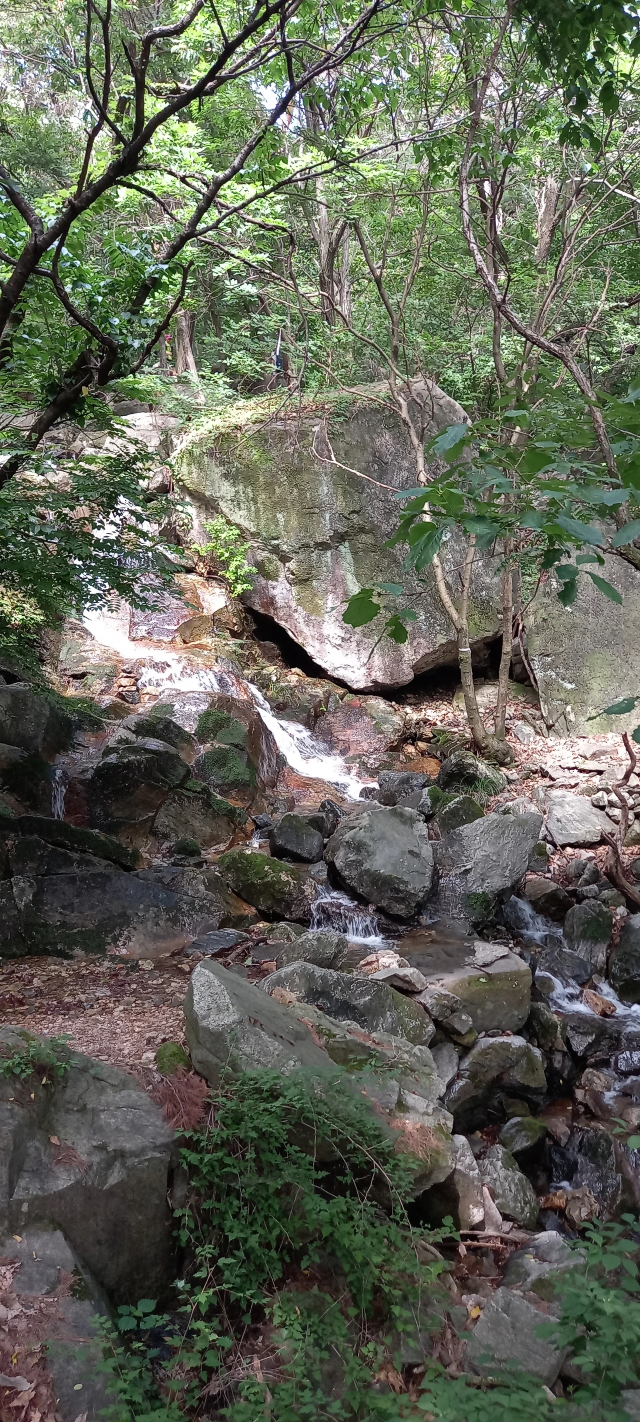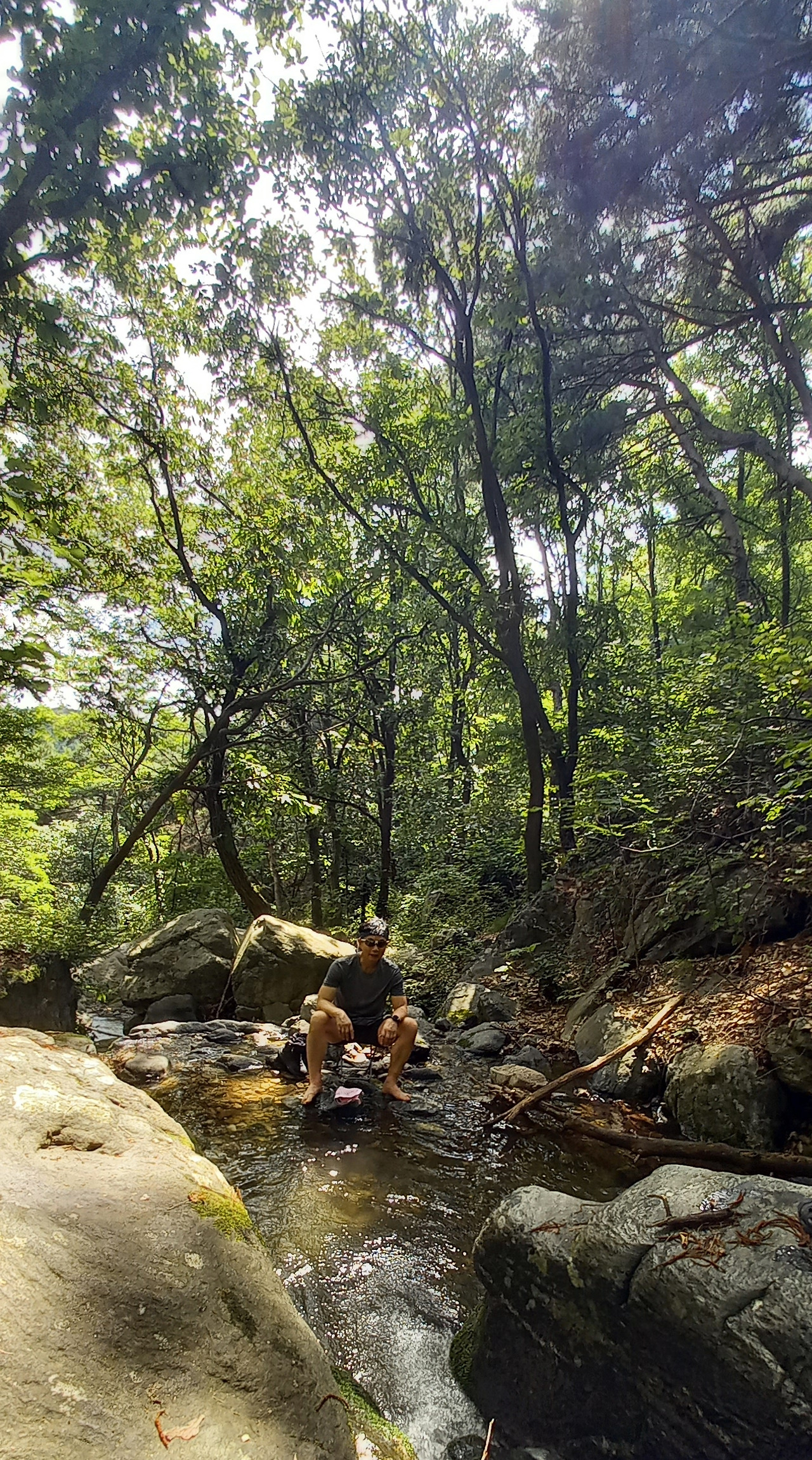드디어 우리가 찾은 장소는 작은 폭포가 있는 계곡이다. 앉아서 발을 담근다. 수온이 딱 알맞다. 발이 시리지도 않고 그저 시원하다. 온몸의 피로가 싹 가신다. 산행 후에는 역시 족욕이 최고이다.