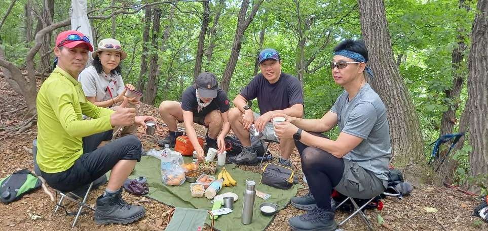 찐 산친구랑 오순도순 산행하는 모습도, 큰 새님 과묵하게 산행하시는 모습도 보기 좋았다. 그야말로 고수님들과 함산 했다. 덕분에 얼린 파인애플, 시원한 얼음물, 달콤한 체리, 살구, 귤, 바나나, 그리고 감칠맛 나는 샐러드, 새콤달콤 유부초밥, 잘 익은 묵은 열무김치, 별식 코다리 무침 등등 맛난 것도 먹고 즐거웠다.