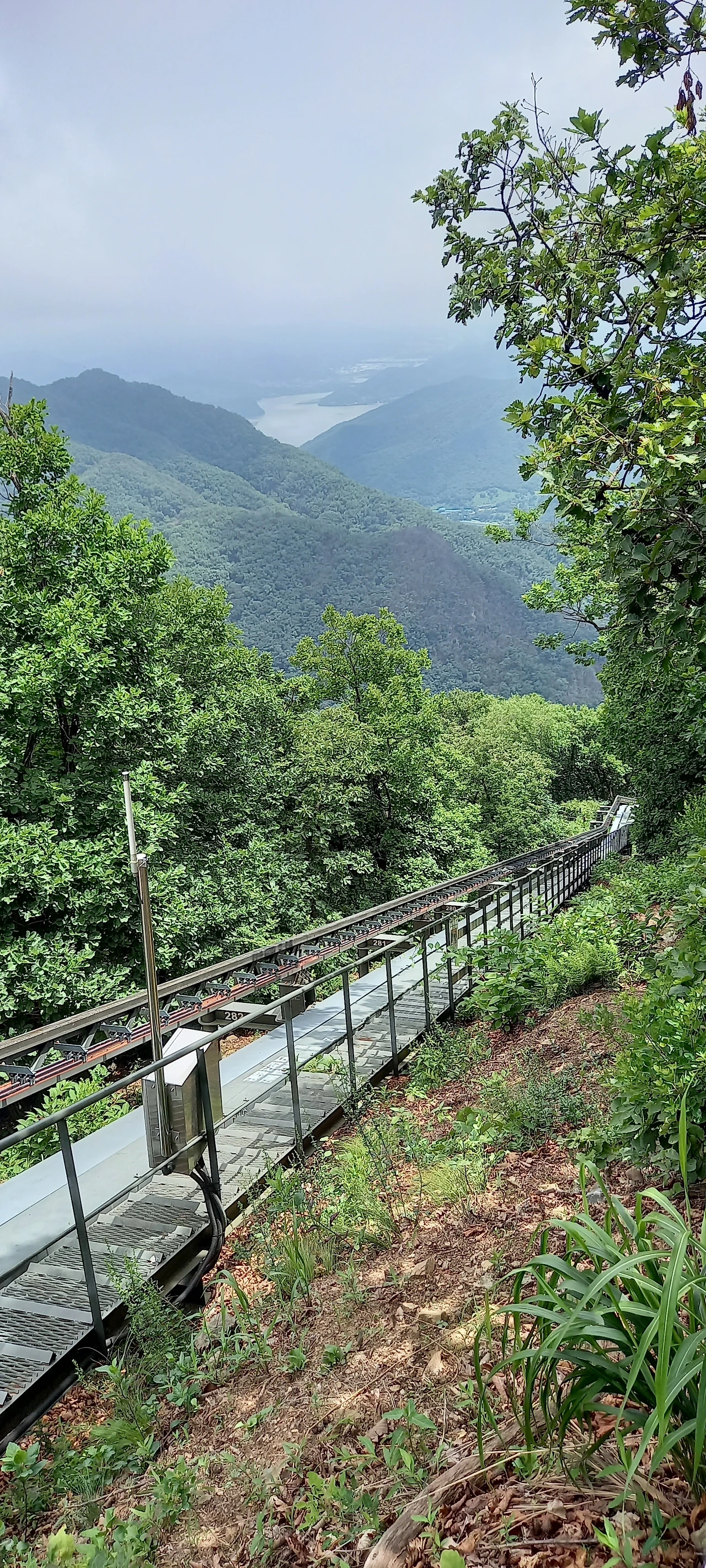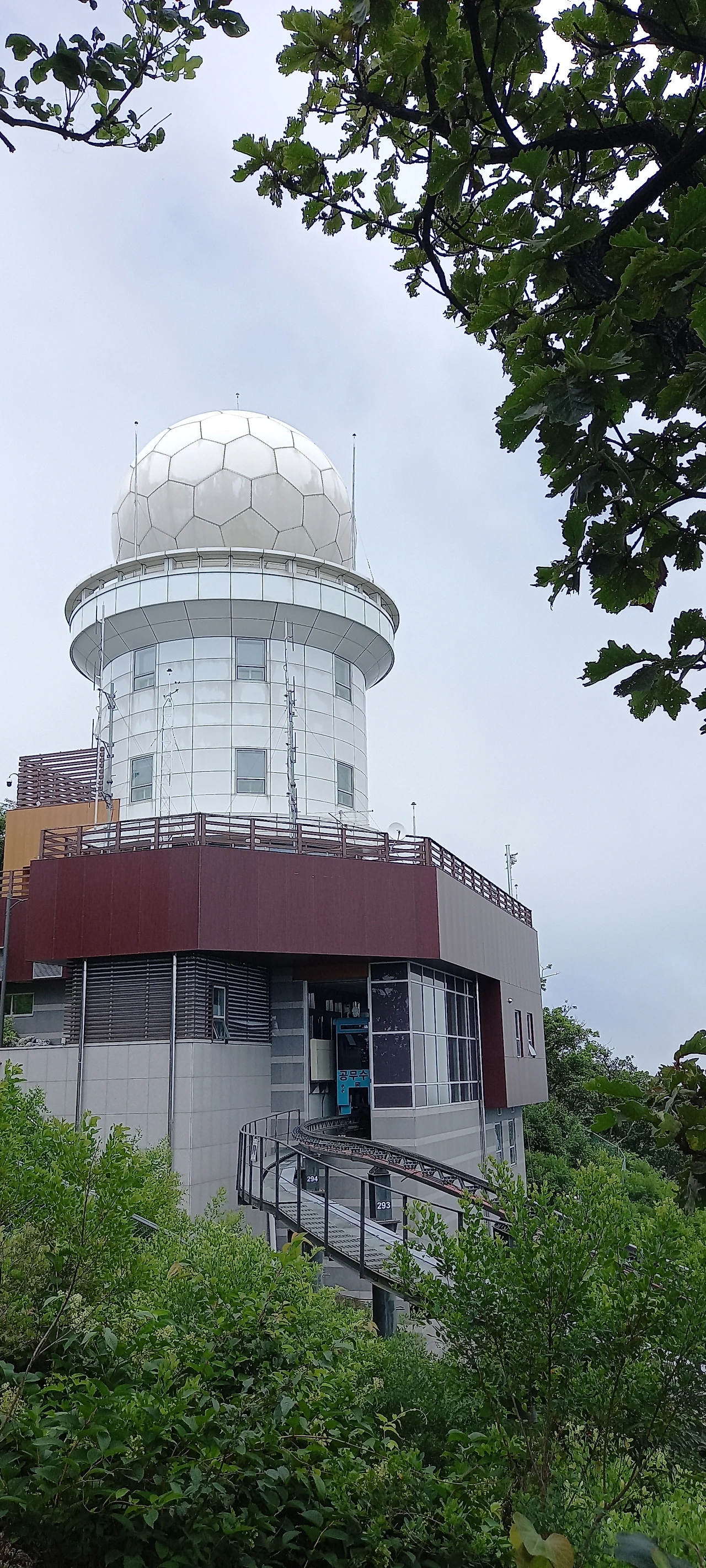 정상은 금방 도착한다. 하얀 강우레이더가 먼저 보인다. 물건을 수송할 때 쓴다는 모노레일이 길게 놓여있다.