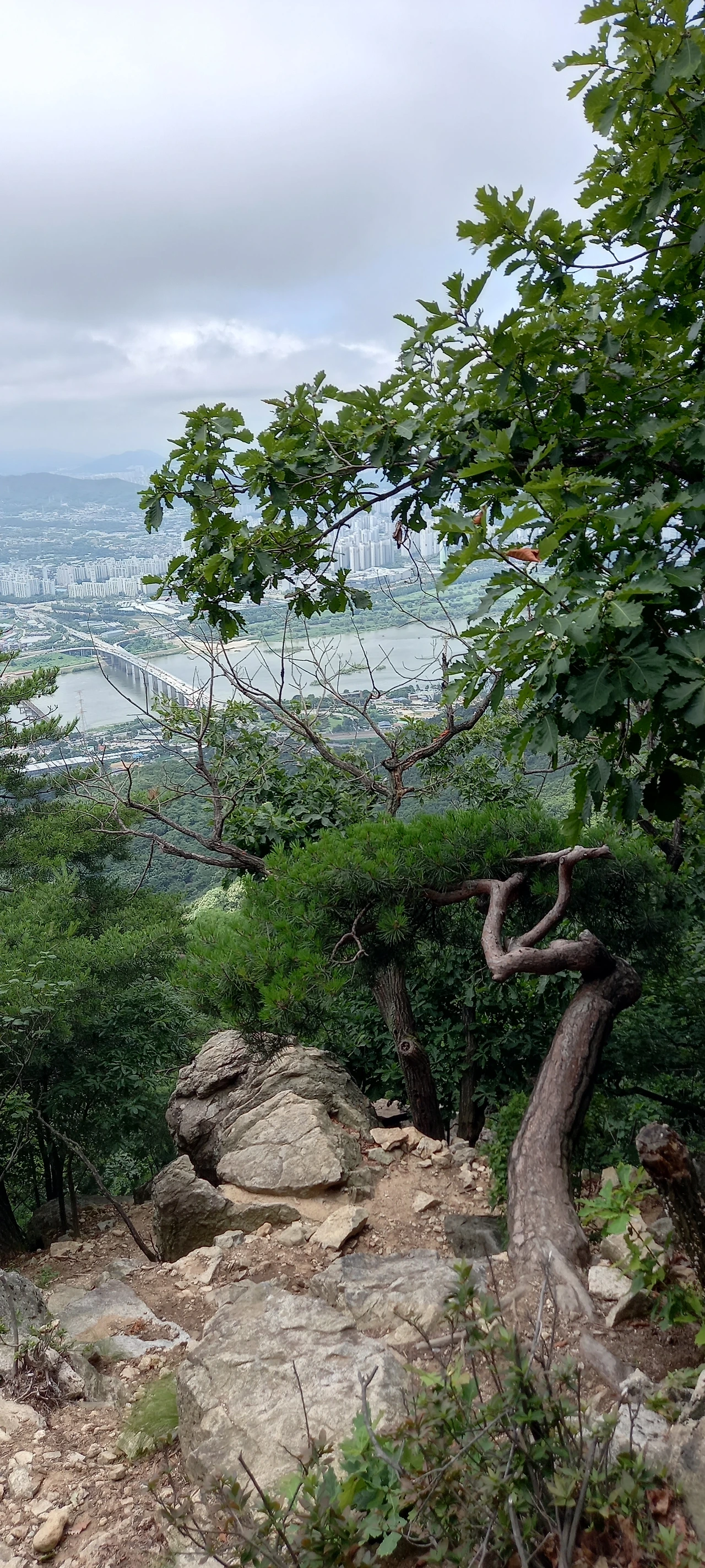 어느 정도 오르니 팔당대교 조망이 터진다. 희한하게 구부러진 나무가 팔당대교를 바라보며 서 있다. 산에서 저런 나무는 바람과 눈비를 많이 맞아서 저리 기괴하게 휘어졌으리라.