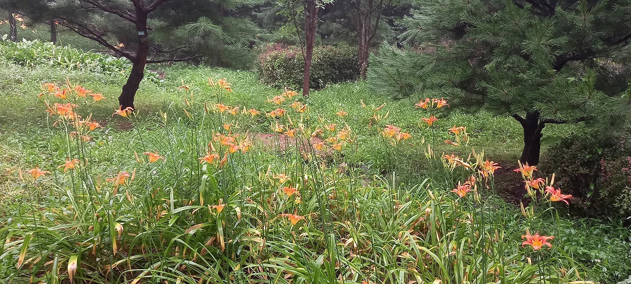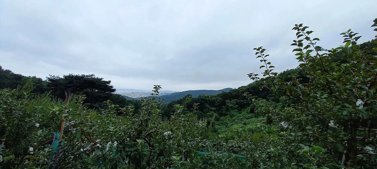 그런데 버스에서 내릴 때 정거장을 지나쳐 용머리다리라는 곳에서 내린다. 트랭글 운동하기를 누르고 광교산 쪽으로 방향을 잡고 도로길을 걸어간다. 숲길로 들어선다. 계곡에 물이 콸콸 흐른다. 임도길로 들어선다. 길 위에도 얕은 강물처럼 물이 흐른다. 조금 더 걸으니 자갈이 깔린 길 옆으로 사과나무 밭이 나온다. 농원이다. 여기서 조금 알바를 한다. 사과나무밭을 빙 돌아서 산길로 들어선다. 광교산 등산로이다.