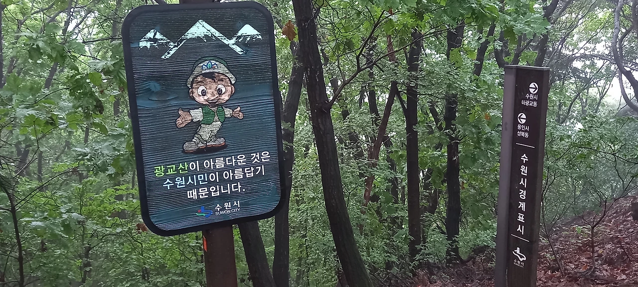 하산해서 보니까 원래 오르려고 했던 상왕교 쪽에서는 길이 다 파여서 광교산 오르는 게 어렵겠다. 관리소에 입산통제 문구가 뜨고, 금지줄도 쳐 있다. 우리는 내려오는 길이라 상관없이 지나왔지만 말이다.