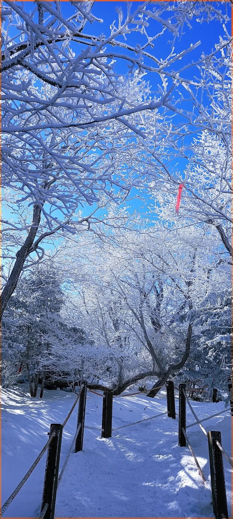 새벽에 이슬비가 살짝 내린 건지 한라산 상고대가 완전 환상이다. 성판악에서부터 뽀드득뽀드득 경쾌한 눈 밟는 소리를 들으며 파란 하늘 위로 눈부시게 피어난 하얀 눈꽃을 보며 진달래대피소를 향해 걷는다. 낮 12까지는 그곳을 통과해야 한단다. 너무나 이쁘고 신비로운 눈꽃세상, 이것이 꿈인가 생시인가?