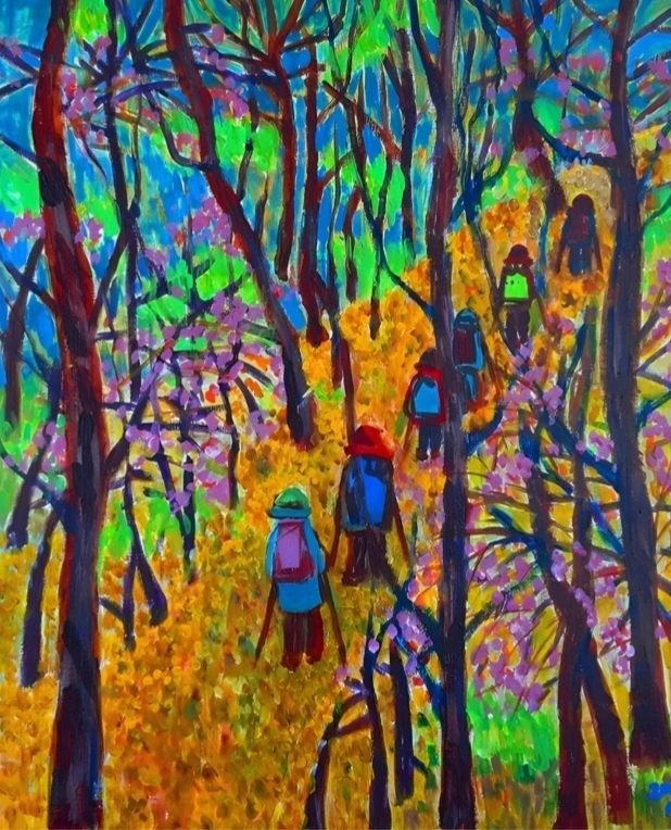 이 그림은 아마도 산행을 다시 시작하고 첫 산행을 한 이천 원적산이 아닌가 싶다. 원적산은 오르락내리락 몇 개의 산을 넘어야 하는 산행이다. 소담봉, 천덕봉, 원적봉, 높은 능선길 위에서 사방을 바라보며 걷는 산행이기도 하다. 하나의 산봉우리를 지나 위에서 아래로 내려갈 때나 다음 산봉우리를 향해 아래서 위로 올라갈 때, 한쪽은 응달이 지고 또 한쪽은 양달이 진 곳에 가을과 겨울과 봄의 공존 현상은 더욱 뚜렷하다.