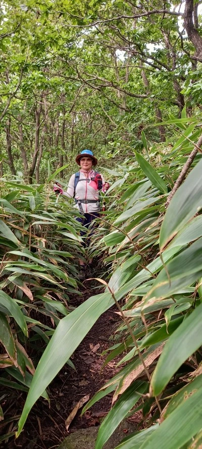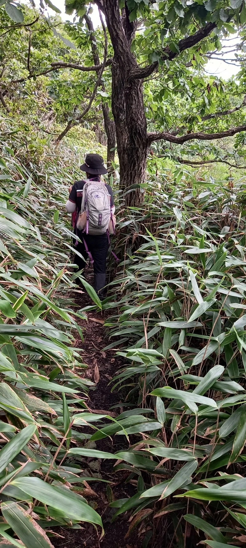 점심 먹고 막 일어서려는데 비가 온다. 우비를 꺼내 입고 내려온다. 조릿대가 어찌나 많이 우거져 길을 가리고 있는지 스틱으로 그걸 헤치면서 털면서 내려오다 보니까 바지도 신발도 다 젖는다.