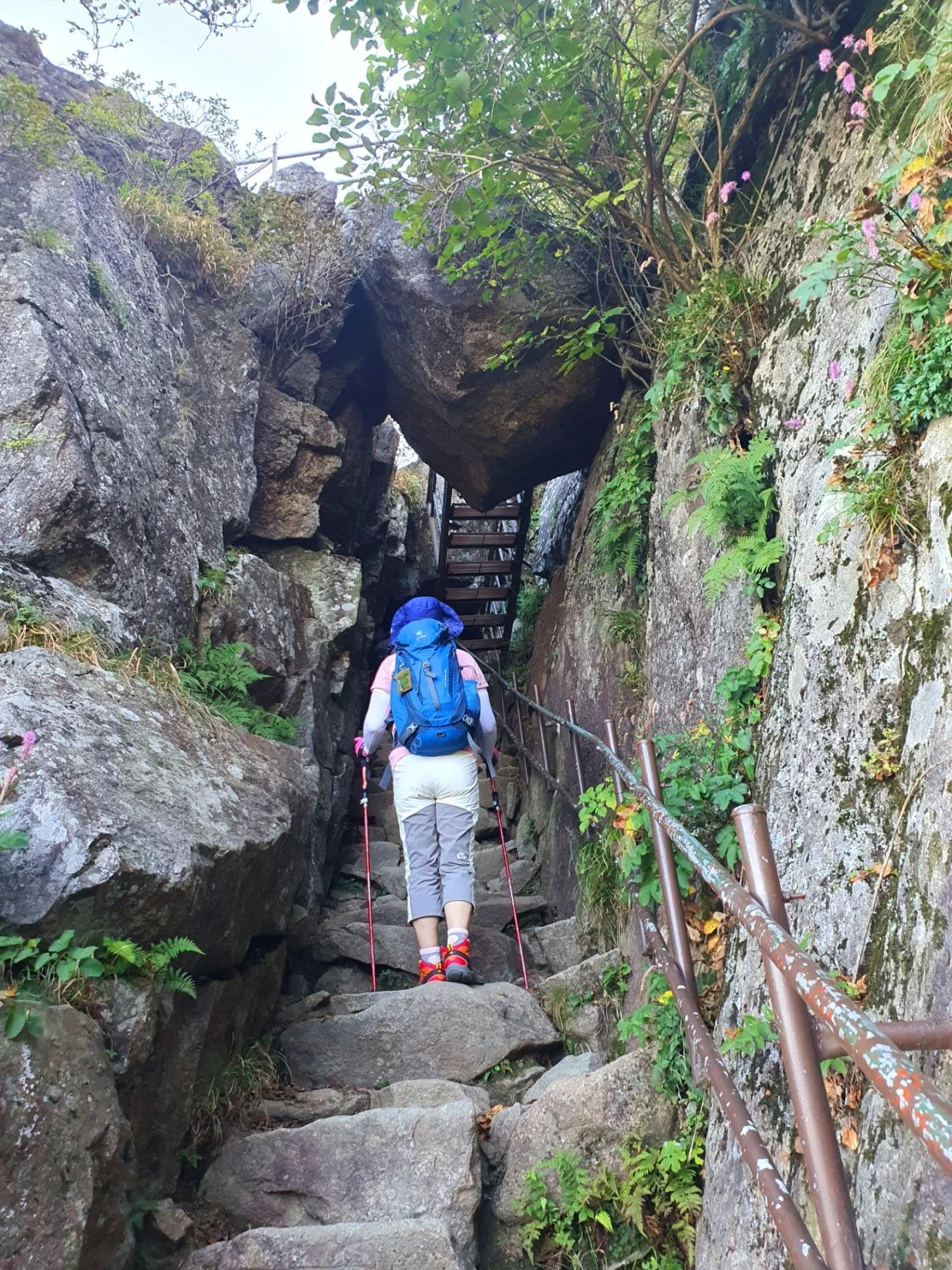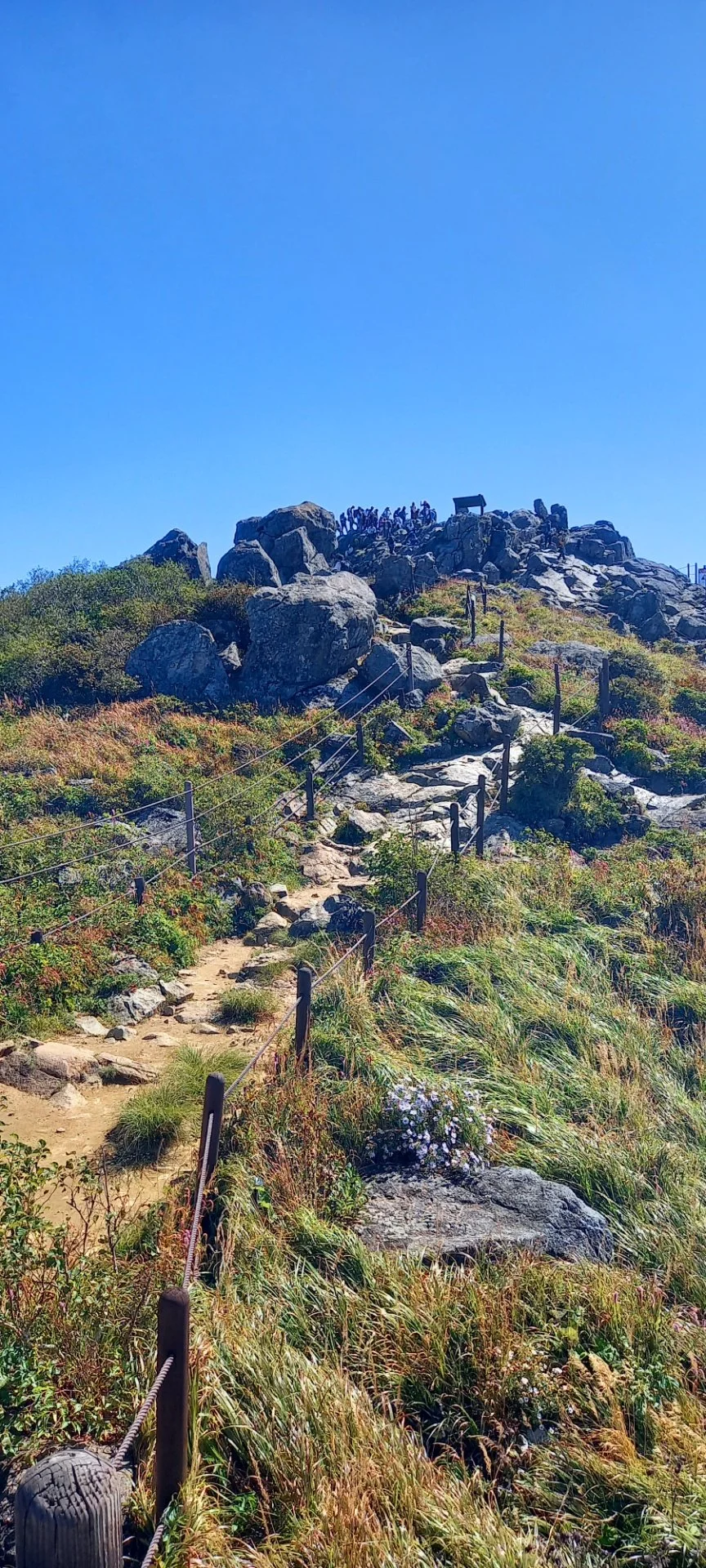 장터목에서 천왕봉 오르는 길에는 오이풀이 주인공이다. 어찌나 많이 피어서 군락을 이루고 있는지 온통 오이풀 천국이다. 분홍빛 오이풀이 고개를 살짝 숙이고 우리를 맞이하는 모습에 아주 정중한 대접을 받는 것 같다. 군데군데 구절초와 다른 꽃들도 피어 있는데 핸드폰 카메라에 담느라 바쁘다.