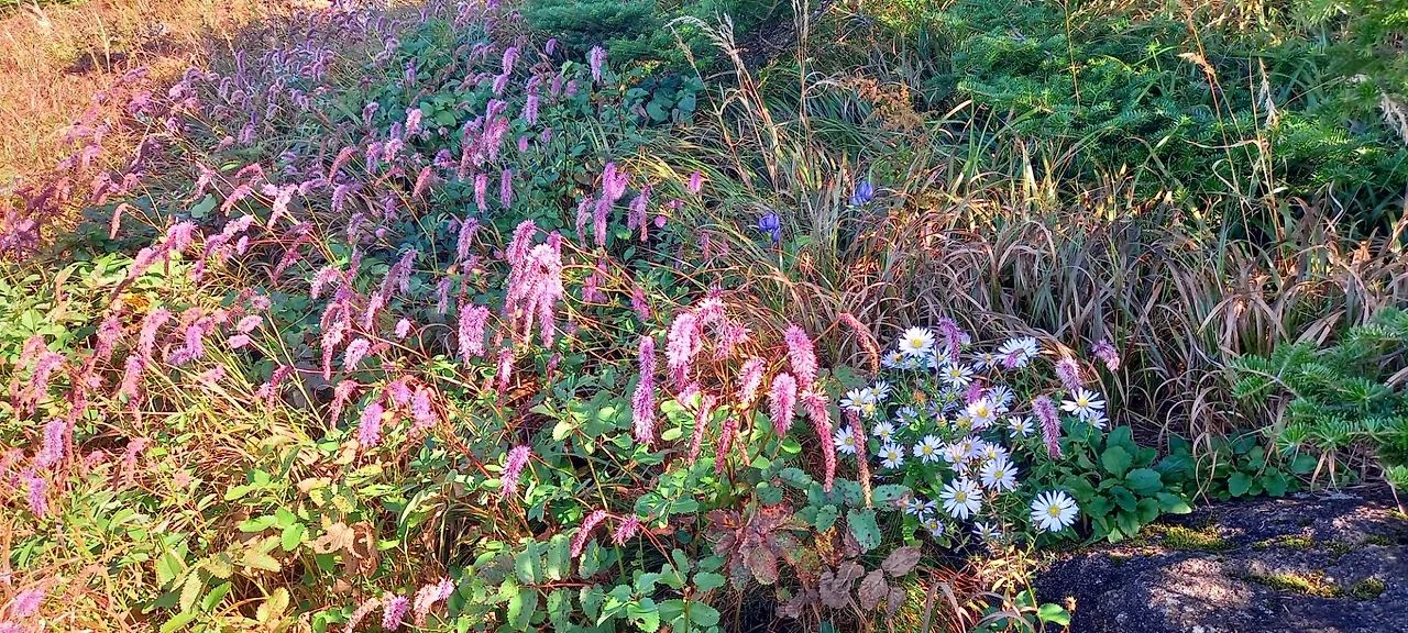 장터목 가는 길에도 야생화가 군락을 이루고 있다. 물봉선, 투구꽃, 배초향, 수국, 엉겅퀴, 박하, 구절초 등이 예쁘다. 한 번도 본 적이 없는 꽃들도 있다.
