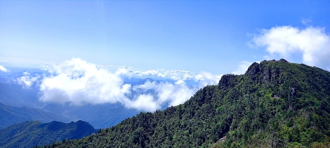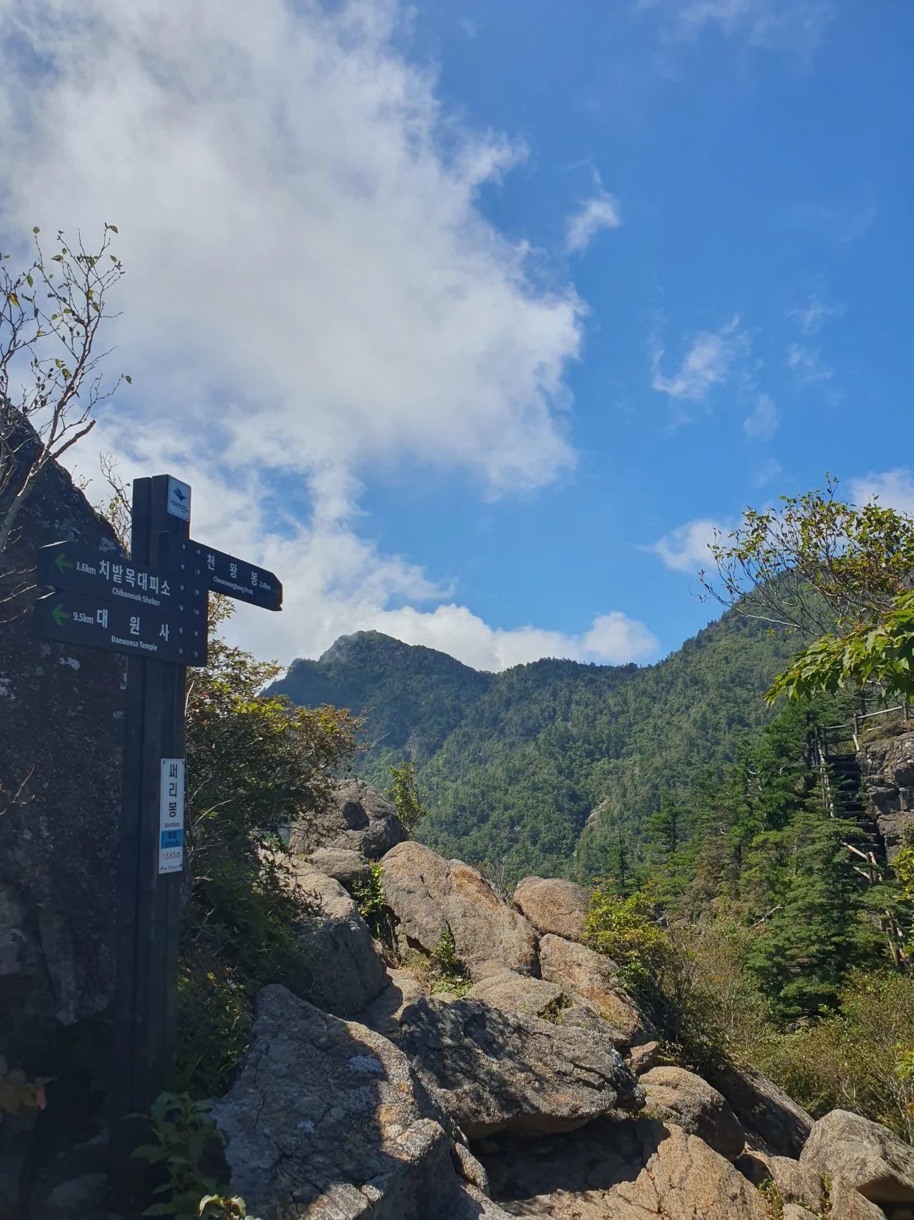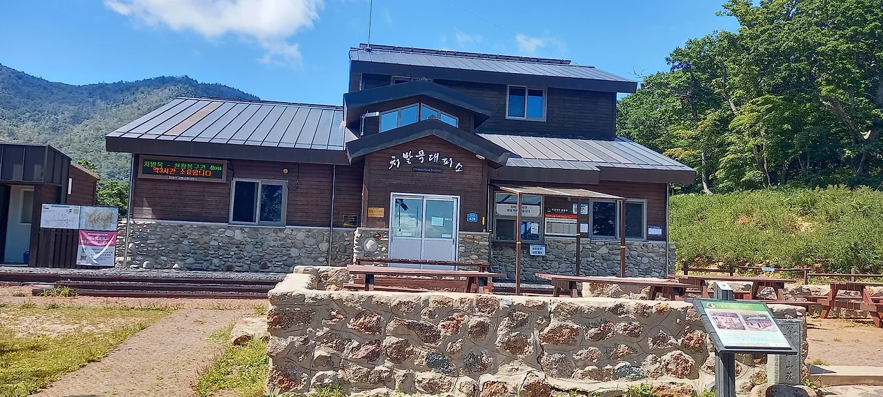 하늘 구름과 놀다가 중봉을 향해 간다. 인증숏 찍고 치밭목대피소 조망을 해본다. 보기에는 금방일 것 같은데 꽤 시간이 걸린다. 그래도 생각보다는 걷기가 괜찮다.