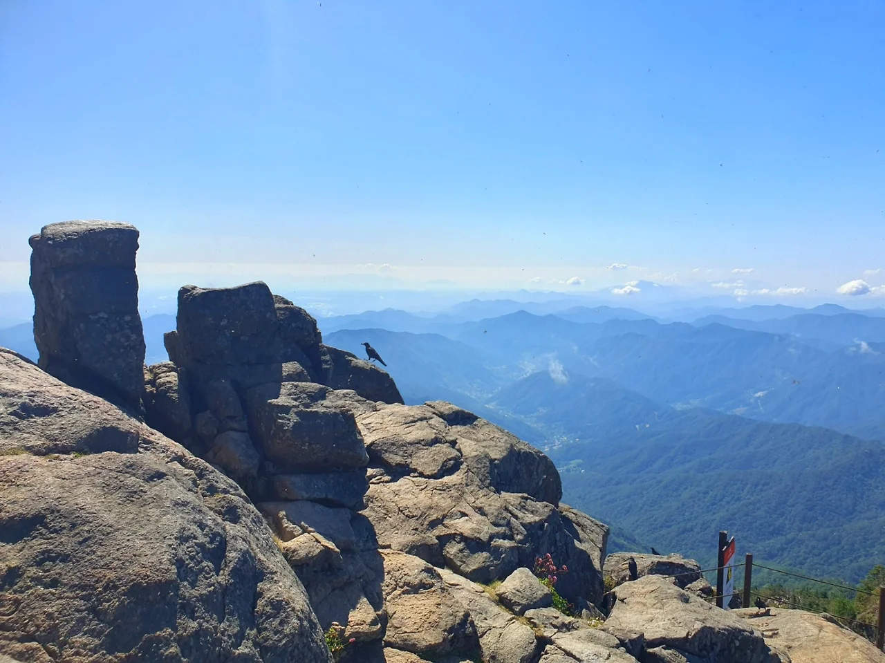 제석봉 안내판 위에 까마귀 한 마리가 날아와 앉는다. 불타 죽은 나무들을 기억하라는 것 같다.