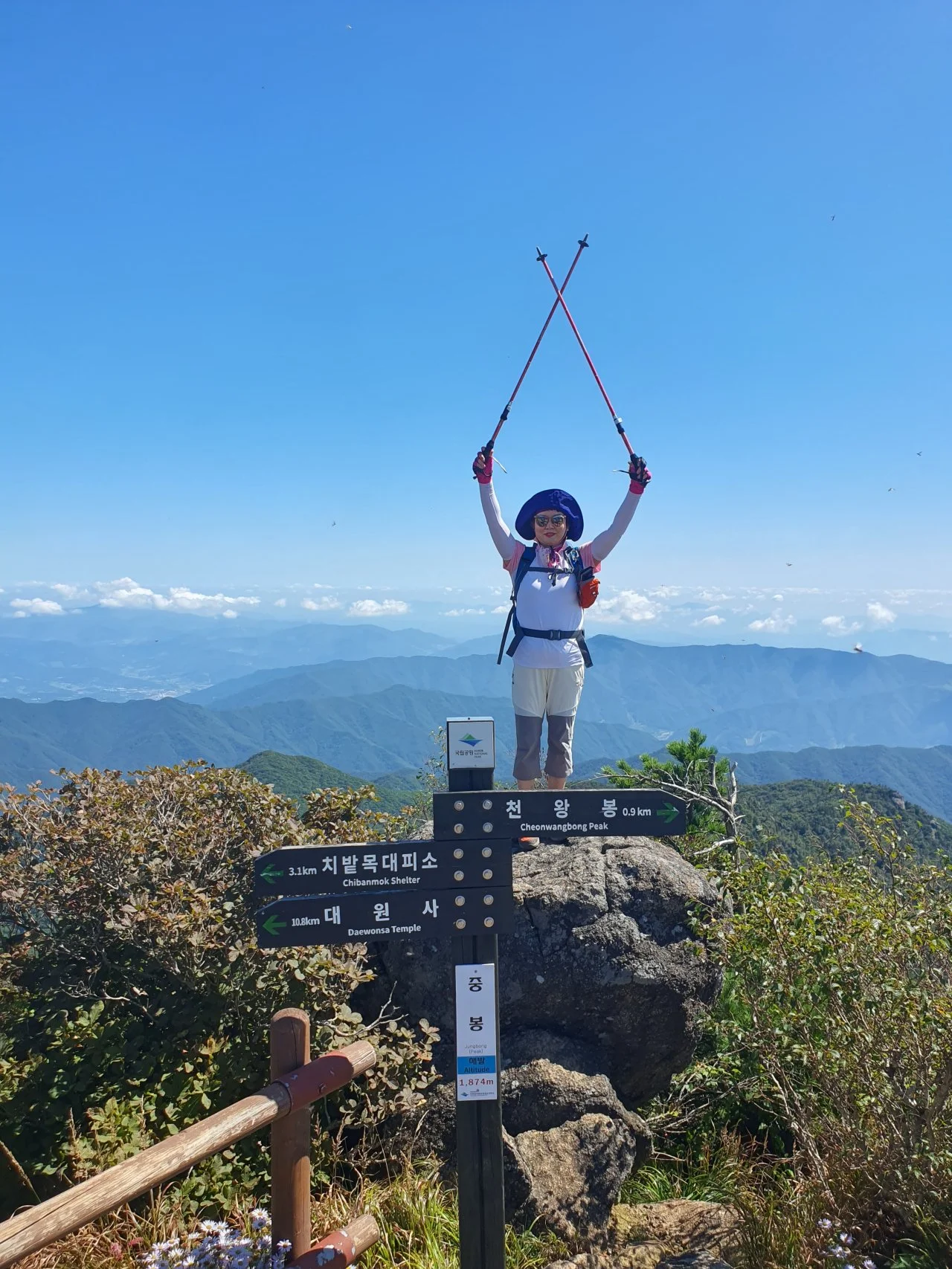 오전 10시 천왕봉에 도착해 인증숏을 찍는 동안 구름이 폴폴 일어난다. 오늘은 사람이 그리 많지 않아 사진 찍기가 좋다. 올만에 천왕봉 정상에서 멋진 개인사진을 남긴다.