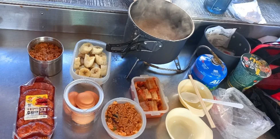 아침 7시에 장터목대피소 도착한다. 날씨가 조금 춥기에 취사실로 들어가 누룽지를 끓여서 묵은 김치와 함께 먹고 계란도 한 개씩 더 먹는다.