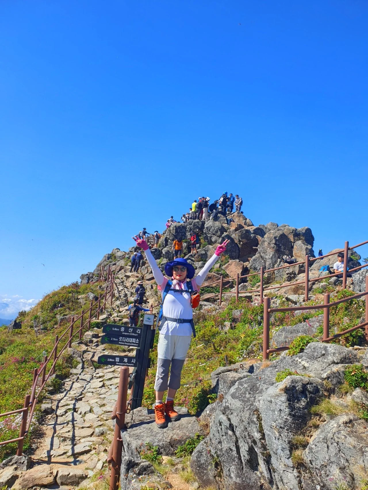 천왕봉이 가까워지자 정상석 옆에서 인증숏을 찍으려는 사람들이 보인다. 오늘은 사람 수가 적당하다. 한 10여 분 기다리면 사람 없는 정상석 사진을 찍을 수 있을 것 같다.