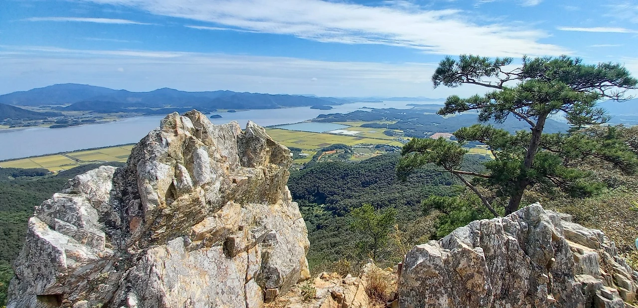 암릉에서 강진만과 가우도 조망 만덕산 정상 깃대봉 인증숏과 강진만과 가우도 조망