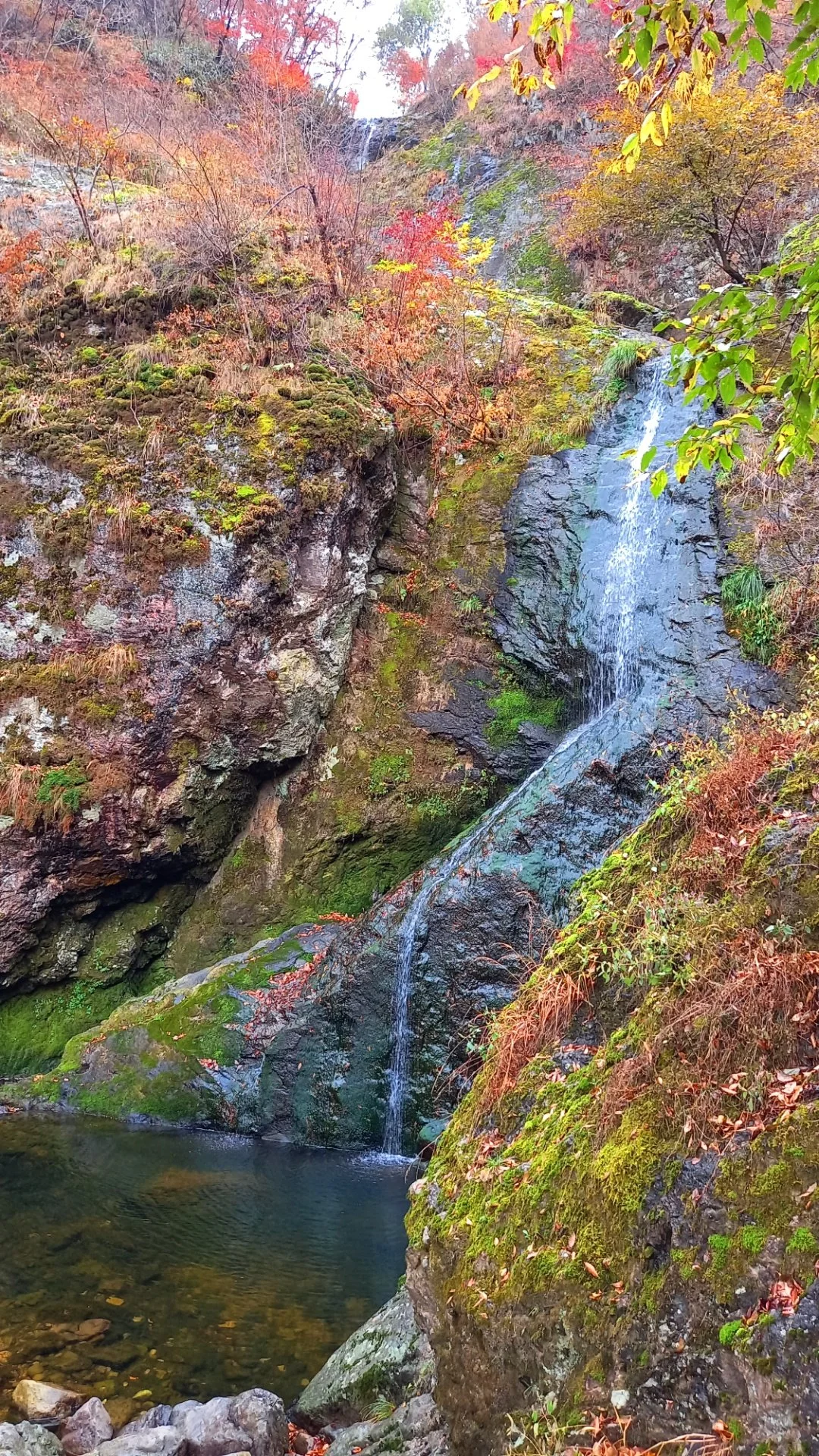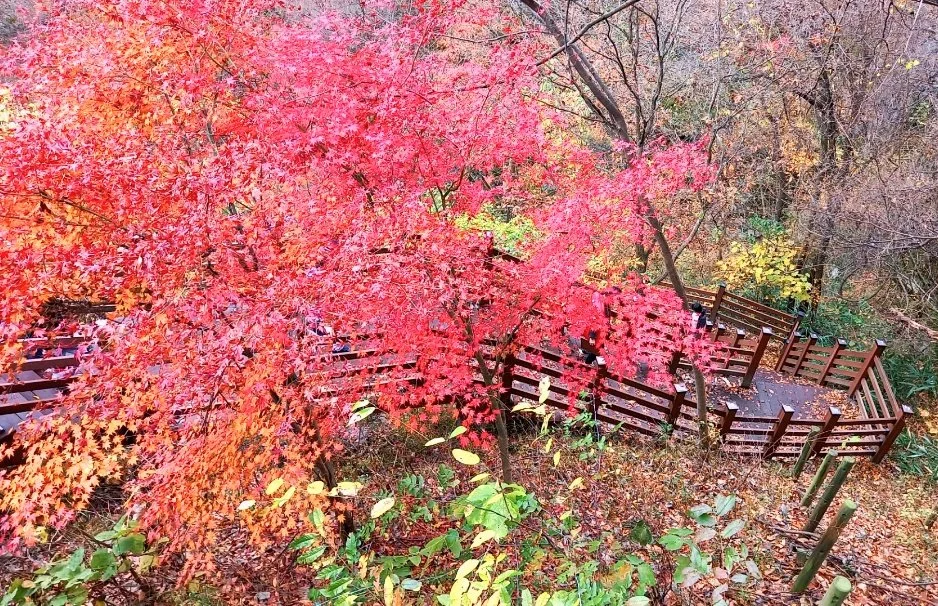 버스로 30여 분 이동해서 위봉폭포로 간다. 한참 가파른 데크길을 내려가야 한다. 빨간 단풍이 곱다. 데크길에 낙엽이 많이 떨어져 비에 젖어서 미끄럽다. 조심조심 내려간다.
