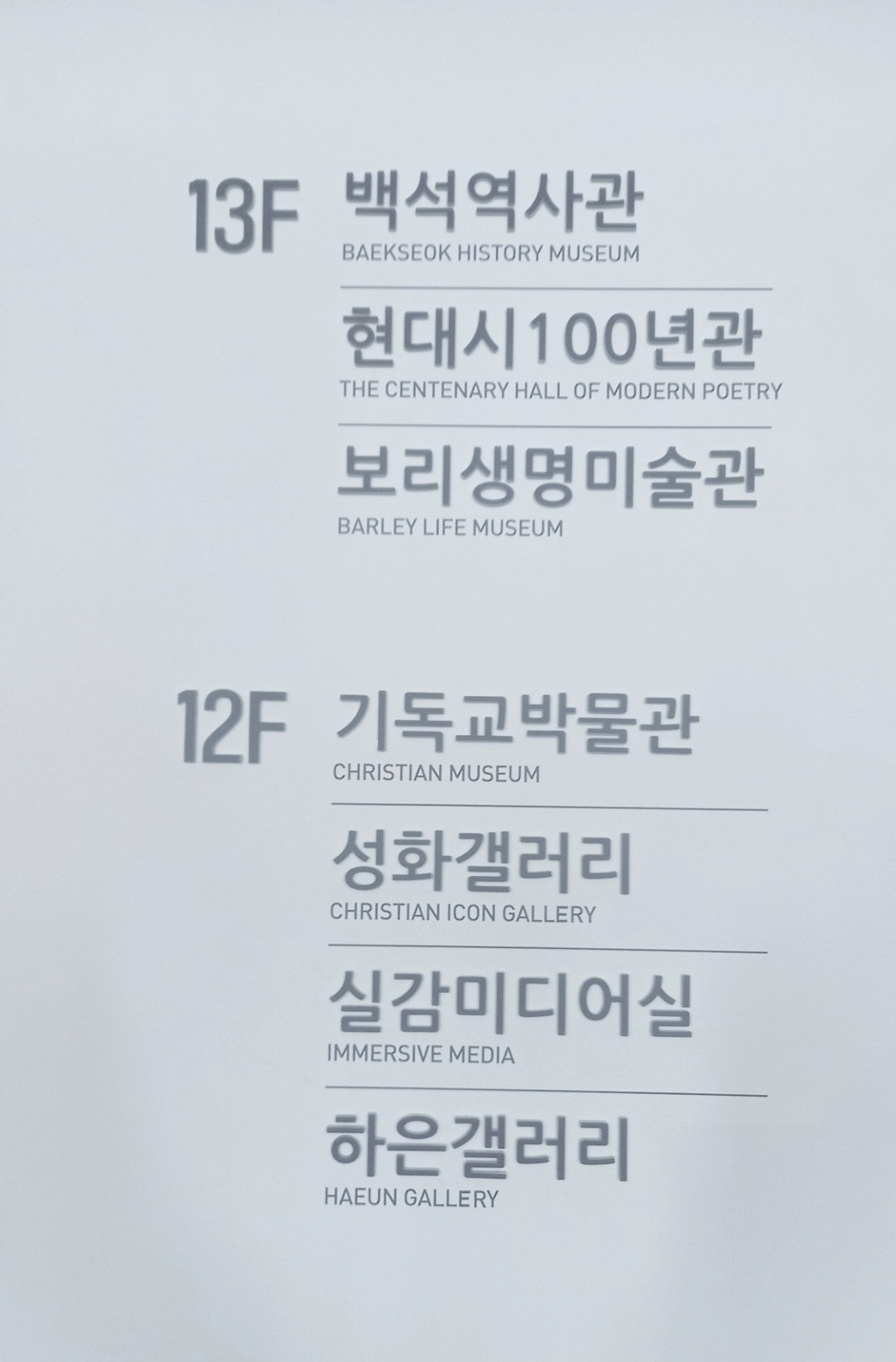 드디어 백석문화대학교라는 글씨가 건물 위에 쓰여있는 창조관에 도착한다. 건물에서 나오는 이가 있어서 물어보니 <산사 현대시 100년관>은 13층에 있단다. 엘리베이터를 타고 올라간다. 12층, 13층에는 미술관도 있단다.