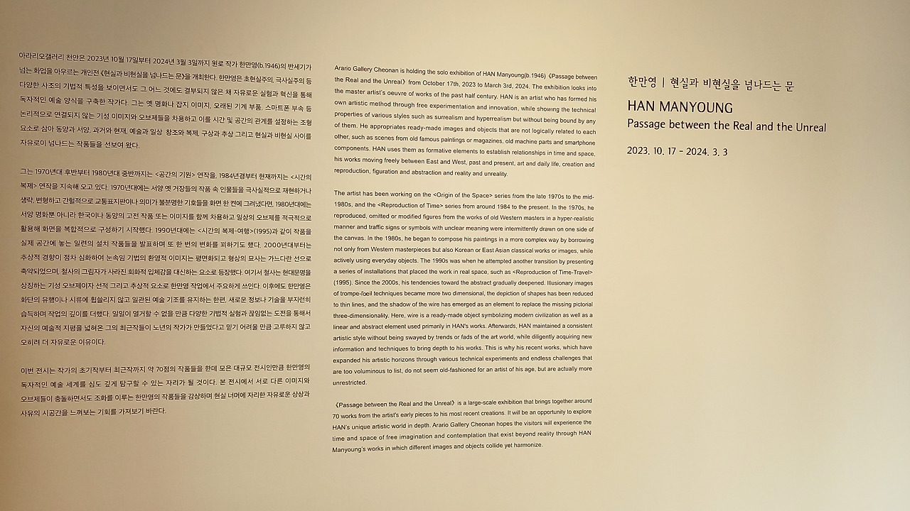 천안 아라리오 미술관은 현대 설치 미술이 전시되어 있다. 한만영 화가의 "현실과 비현실을 넘나드는 문"이라는 제목의 작품들이다. 좀 이해하기는 쉽지 않지만 아이디어는 기발하다 생각하며 관람한다.
