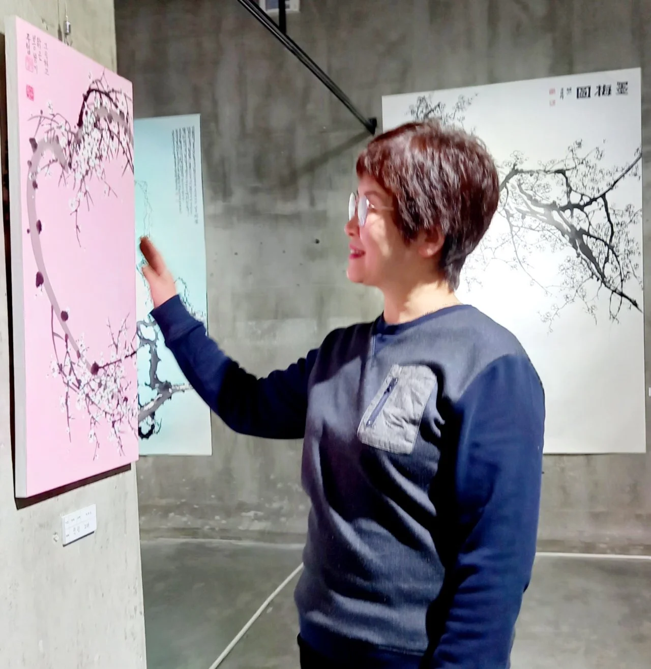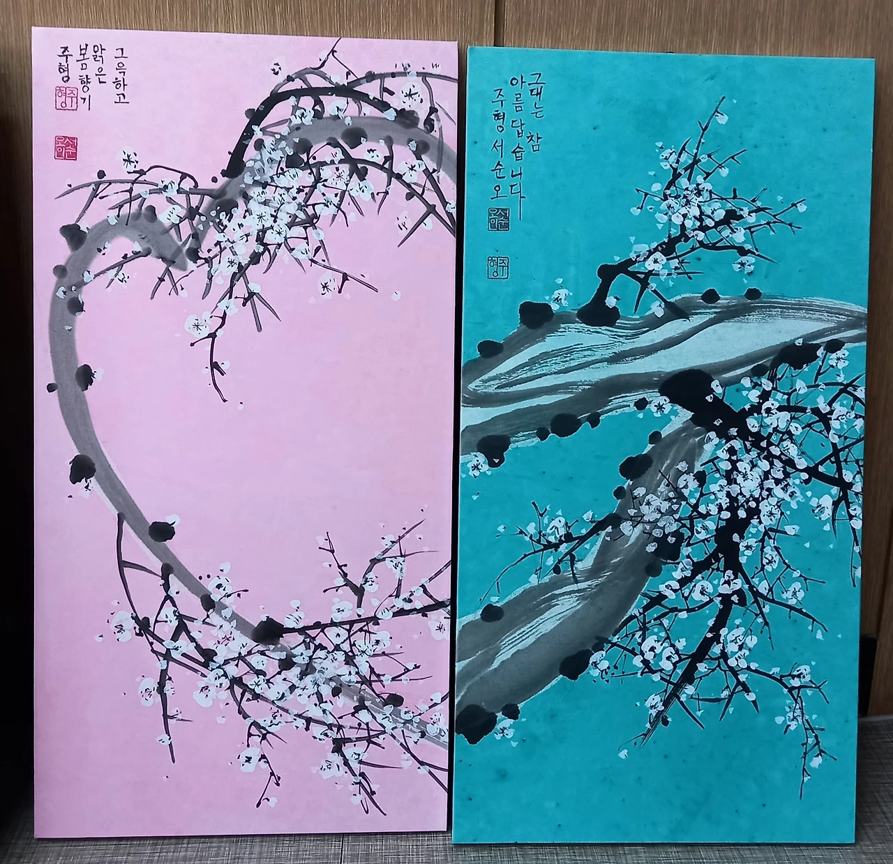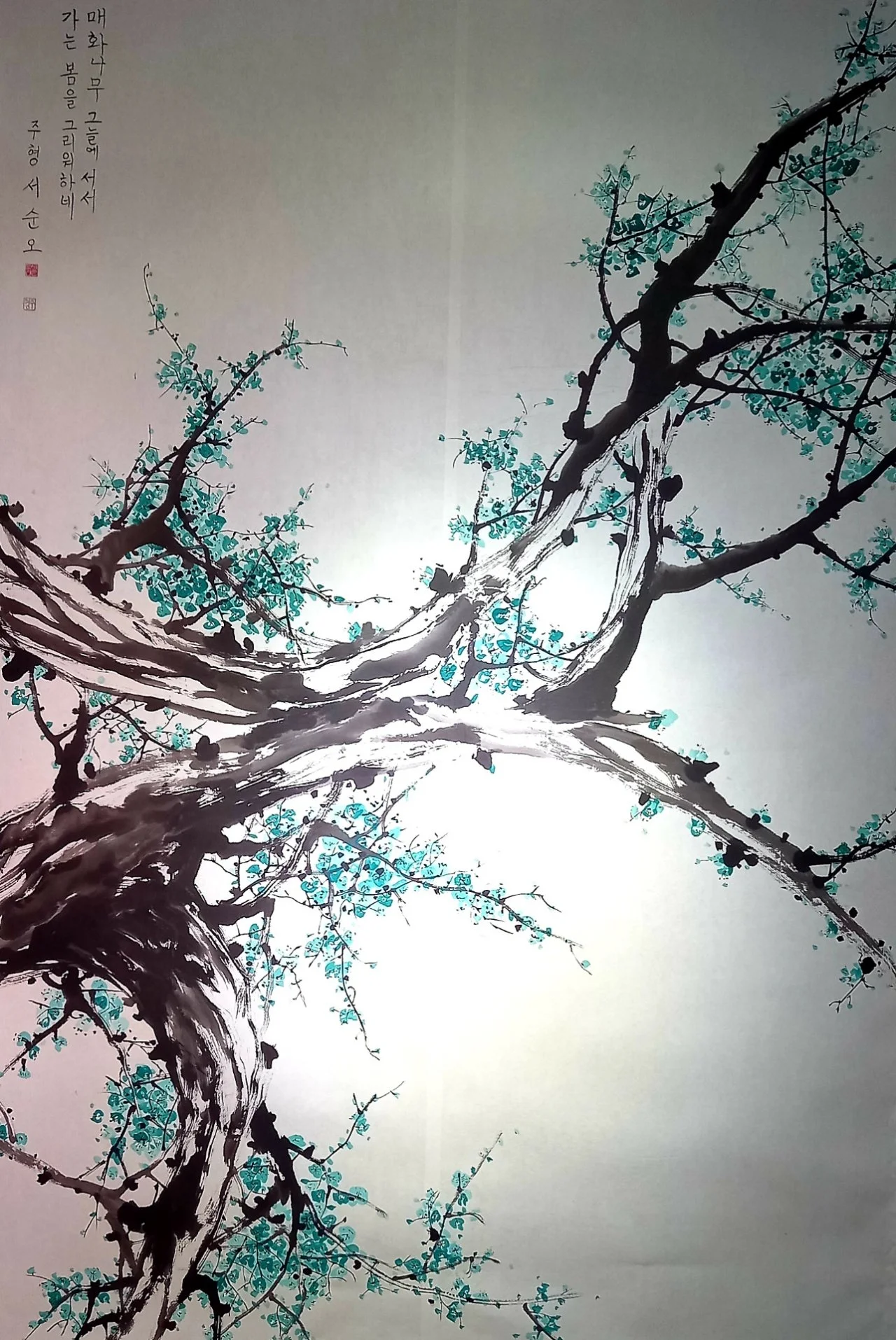 나는 올 1년 동안 매화만 그려서 작품이 매화뿐이다. 사군자 중 매화가 첫 번째로 나오는 걸 보면 옛 선인들도 매화를 으뜸으로 꼽지 않았을까 싶다. 봄보다 먼저 오는 이른 봄 맑고 그윽한 매화 향기, 속눈썹이 긴 매화에 취하는 설경 속 봄, 매화만큼 곱고 착하면 좋겠다는 생각에 <맑고 그윽한 봄>, <봄 향기>, <매화에 취하니>, <고운 그대>. <착한 그대>라는 제목을 붙여 보았다.