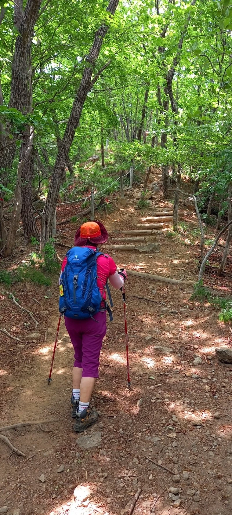 정상까지 가파른 돌계단, 나무계단, 로프 구간 힘들게 이어진다. 그래도 바람이 시원하게 불어주고 햇빛이 거의 안 보이는 숲길이라 엄청 시원하다. 뒤돌아보면 저길 올라왔구나 감개가 무량하다.