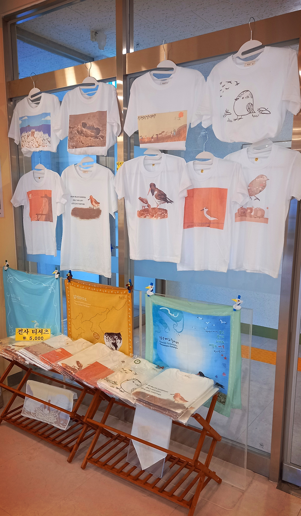 다 보고 지하 기념품 코너로 내려가서 기념품을 산다. 신성리 갈대밭 티셔츠와 검은머리물떼새 손수건 한 장이다. 차암 예쁘다. 시간이 넉넉하다면 직접 만들어서 가져와도 좋겠다.
