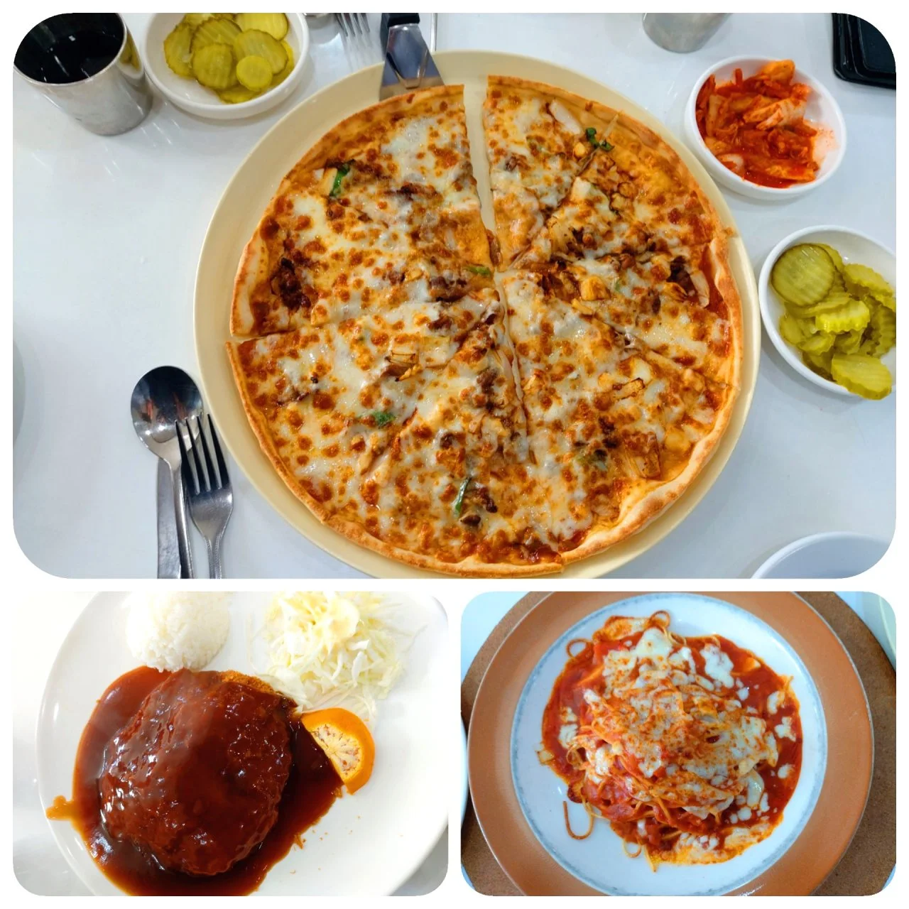 그래서 계단을 따라 조금씩 높이 올라가니 포토존들이 쭉 있고, 계단 끝에 성처럼 생긴 건물 안에 레스토랑이 있다. 치즈마을인 만큼 치즈 돈가스, 치즈 스파게티, 불고기바비큐 피자로 점심식사를 주문한다. 한참 기다리니 맛있는 음식이 하나씩 나온다. 제일 먼저 피자가 나오고, 돈가스, 스파게티 순서로 나온다. 치즈가 듬뿍 들어간 음식을 화기애애하게 먹는다.