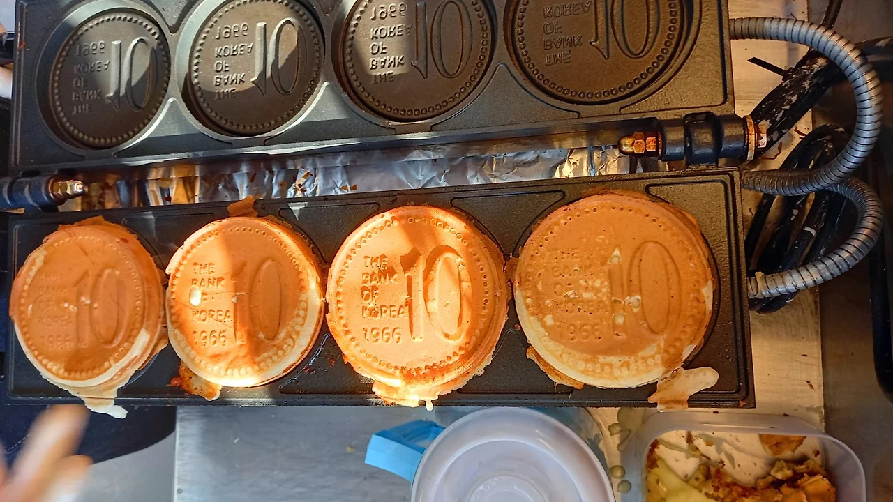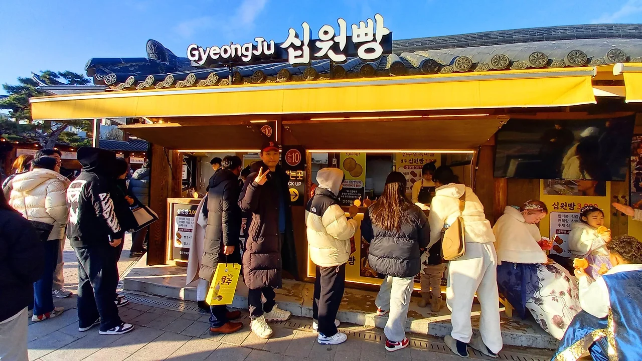 밥은 임실치즈테마파크에서 점심에 배부르게 먹어서 뭘 더 안 먹어도 되겠는데, 전주한옥마을 여기저기 추억의 군것질거리 파는 데가 많다. 찹쌀호떡, 10원빵, 50원빵, 100원빵, 닭꼬치 등등 먹거리가 곳곳에서 우릴 유혹한다. 할 수 없이 10원빵 1개를 3천 원에 사서 맛을 본다. 막 구운 손바닥만 한 10원빵 안에 치즈가 듬뿍 들어 있어서 넘 고소하고 맛있다.