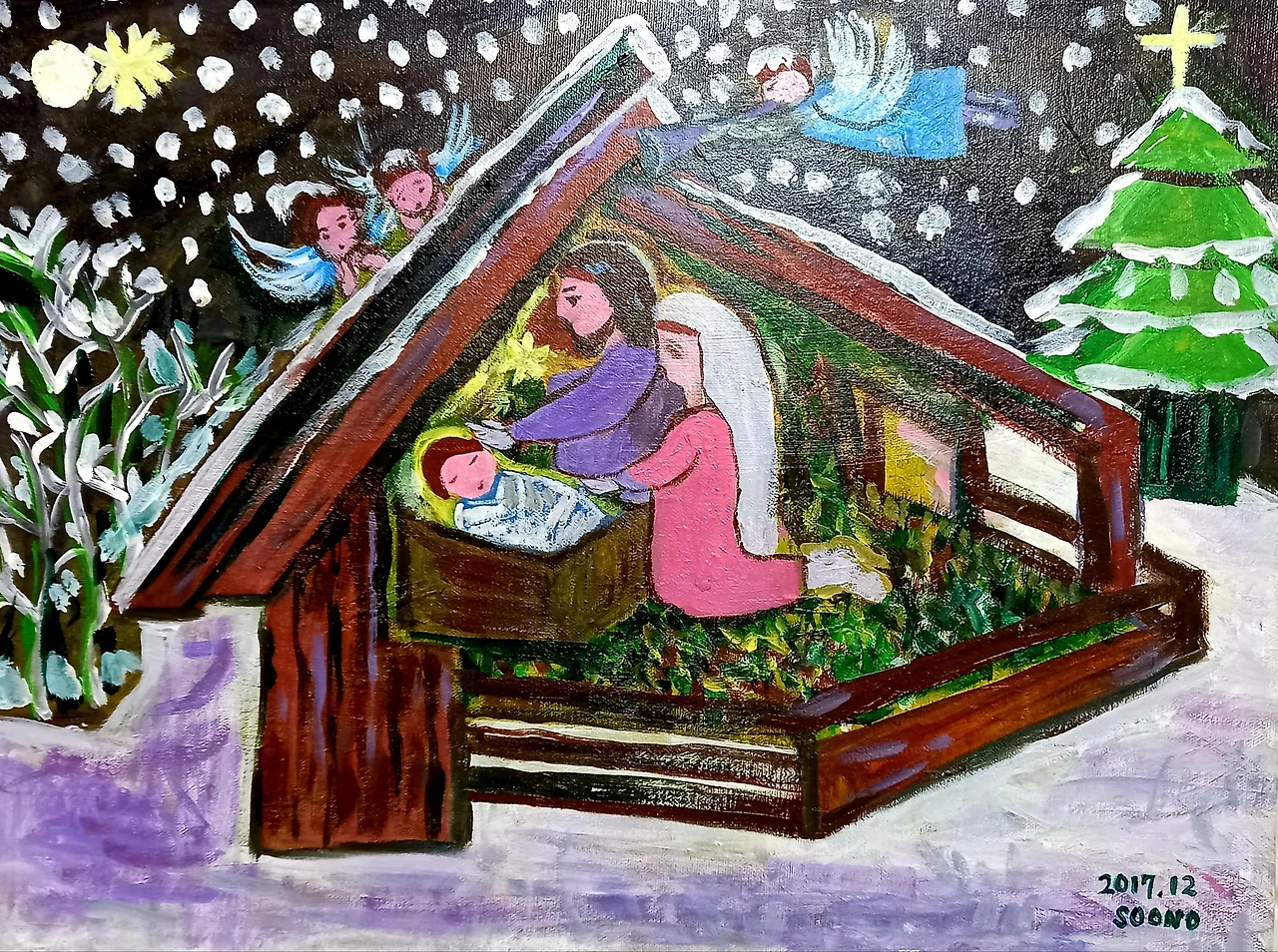 성탄절이 아기 예수님보다 산타가 더 주인공이 된 데는 안타까움이 앞선다. 그래서 나는 말구유에 나신 아기 예수님을 알리며 천사들이 축하의 나팔을 불고, 마리아와 요셉이 경배하는 그림을 그려보았다. 하늘에서는 축복처럼 흰 눈이 펑펑 쏟아진다. 성탄트리와 십자가도 그려 넣는다. 나무의 녹색은 생명을 상징한다. 우리에게 영원한 생명을 주실 아기 예수님의 탄생이기 때문이다.