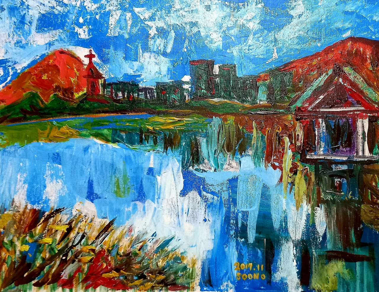 여름, 이곳에 와서 그림도 그리고 시도 썼다. 호수랑 하늘이랑 구름이 하나가 되어 나를 반긴다. 호수에 비친 하늘이 구름이 전혀 따로 떨어져 있는 것 같지 않다.