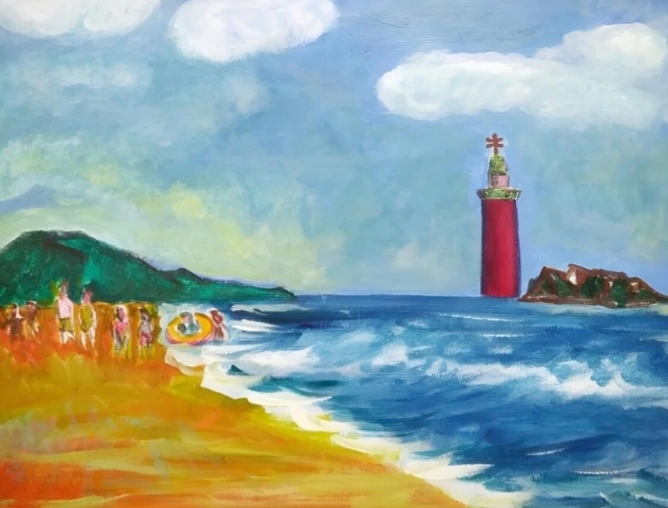 바다와 등대를 그리고 철썩이는 파도와 해수욕하는 사람들을 그린다. 실제로 등대가 있었던 것 같지는 않다. 내가 그려 넣은 것이다. 등대는 18~19세기에 처음 세워졌다고 한다. 바다에서 길잡이 역할을 하는 것이 등대이다. 불을 피워서 빛을 내기도 하다가 전기로 불빛을 내다가 지금은 LED 등 같은 자동센서로 빛을 내기도 한단다.