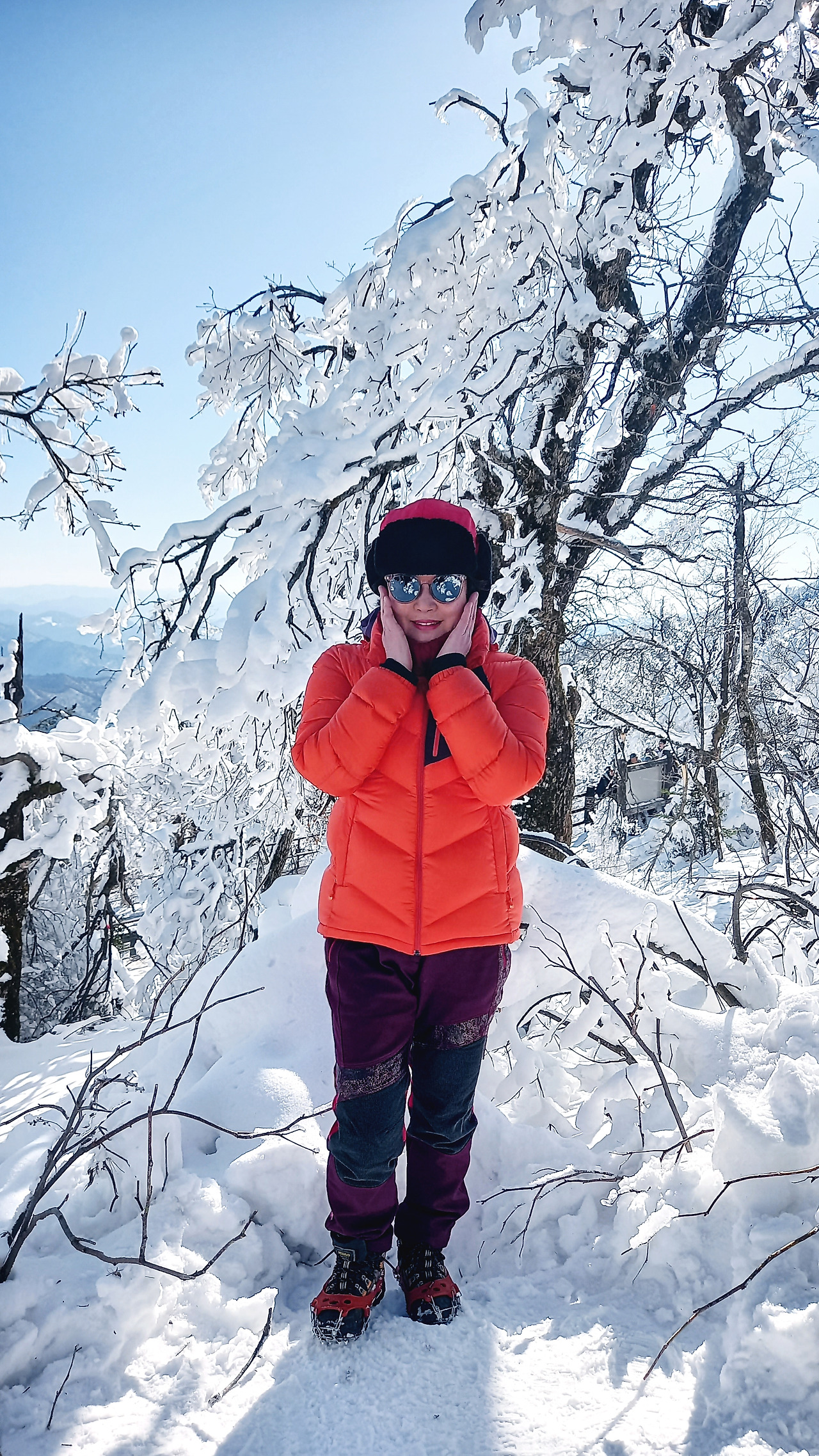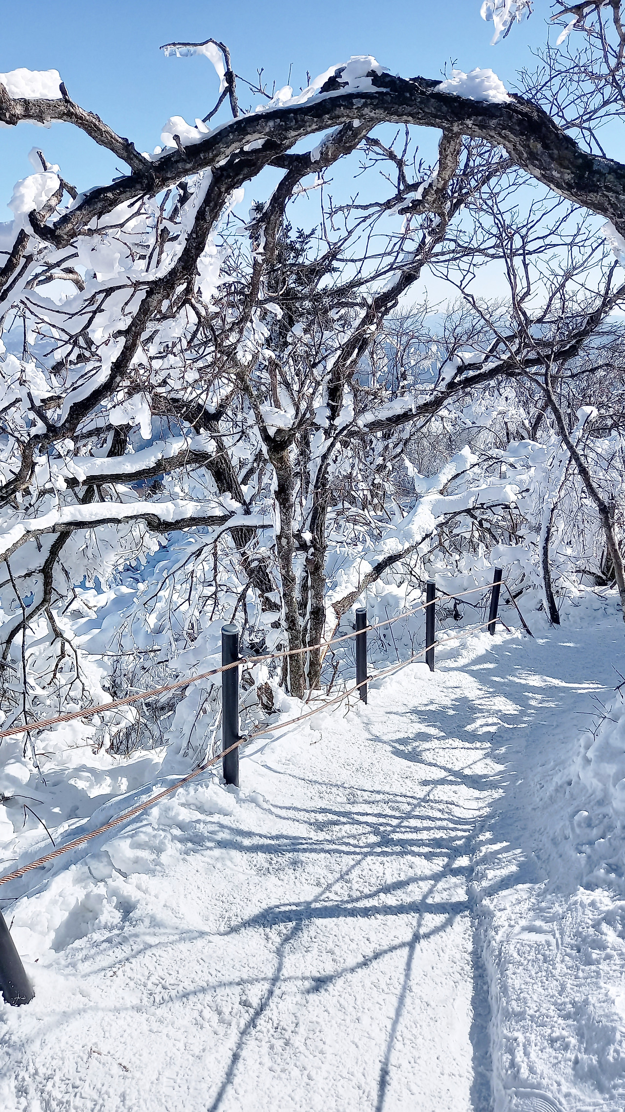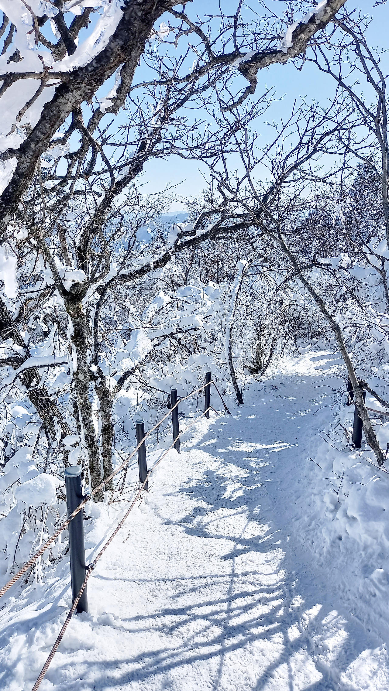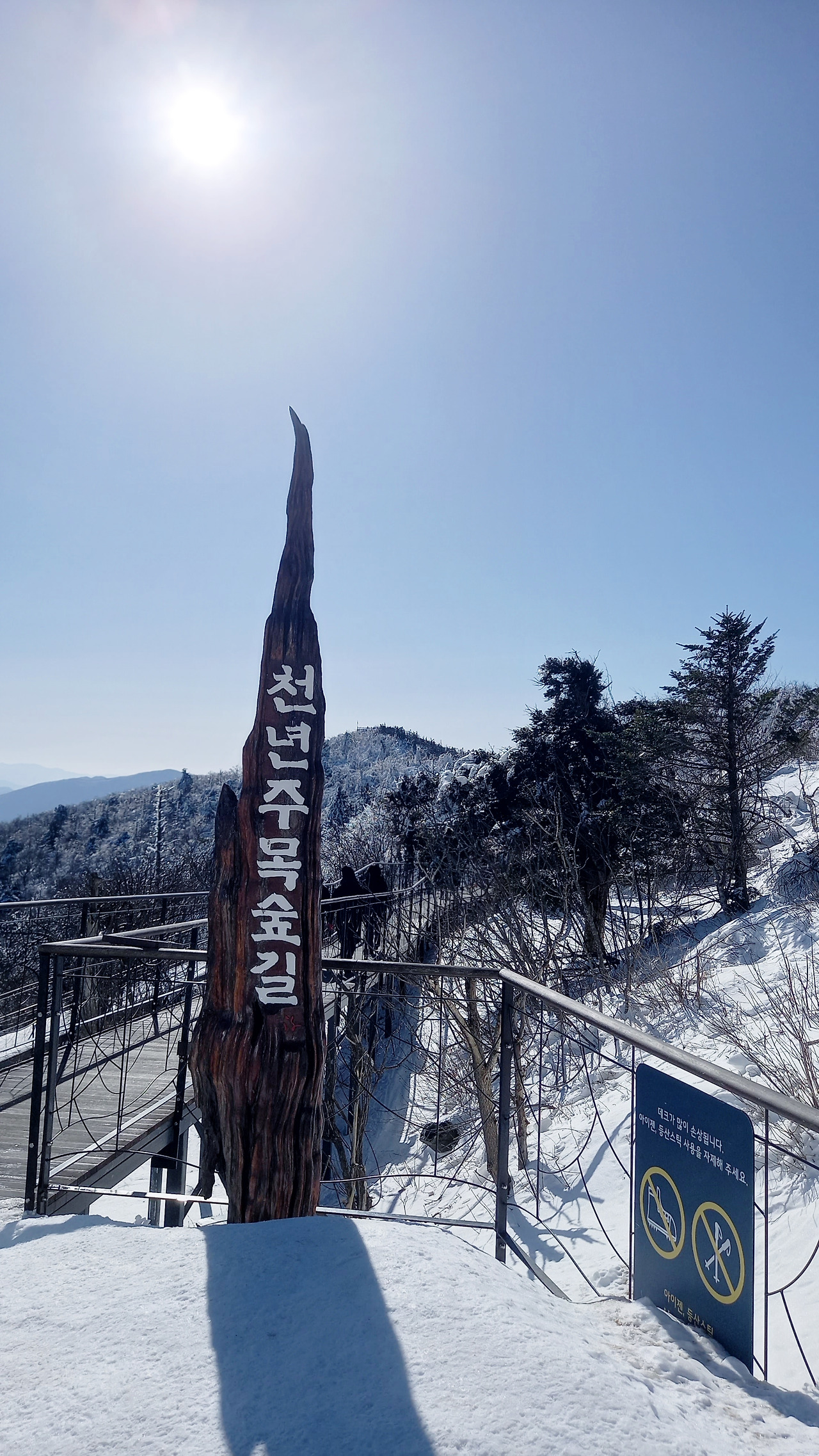 발왕산 곤돌라 내리는 데서 정상까지 눈꽃길이 그리 길지는 않지만, 싱그럽게 걷는 맛이 있다. 날씨가 영하라는데 손도 안 시리고, 옷 입은 게 너무 두꺼웠던지 덥다.