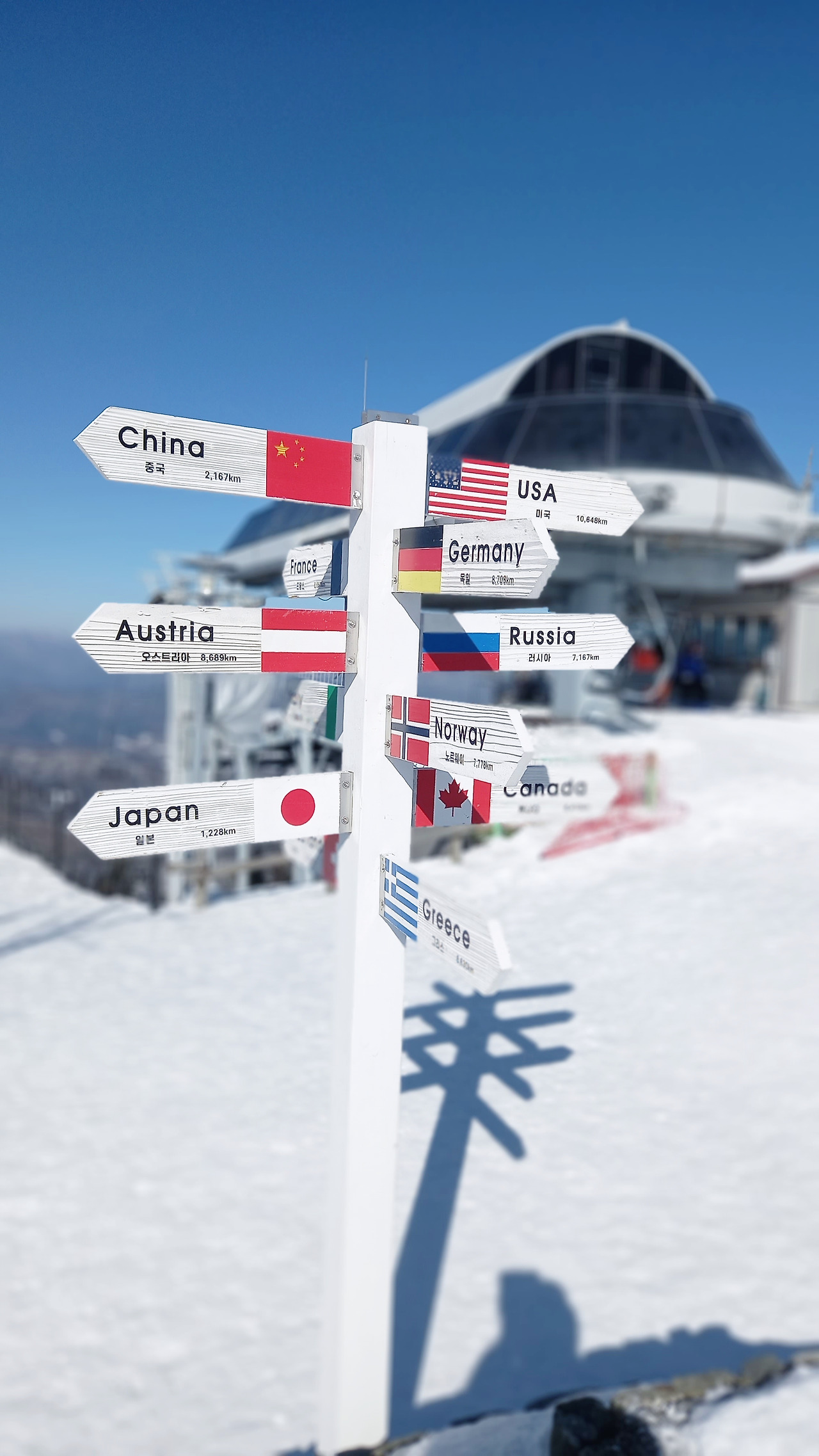 아까 올라갈 때 못 보았던 곳 자세히 보고 곤돌라 타는 곳 옆 전망대에서 주변 조망을 해본다. 대관령, 정동진까지 산봉우리와 산능선 너머에 있다고 안내가 되어 있다. 아마도 하얀 풍력발전기가 돌아가는 저 너머인 듯하다.