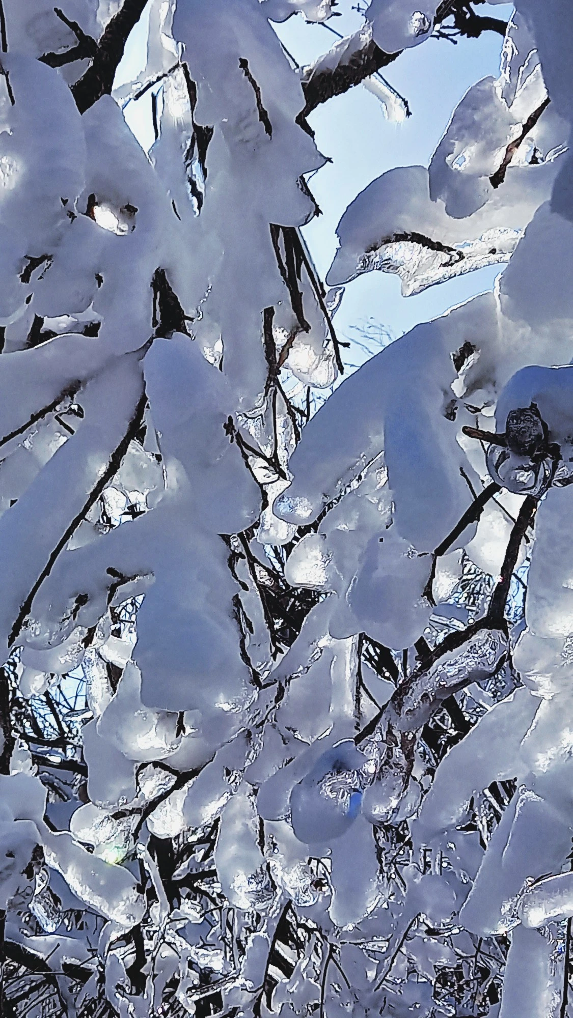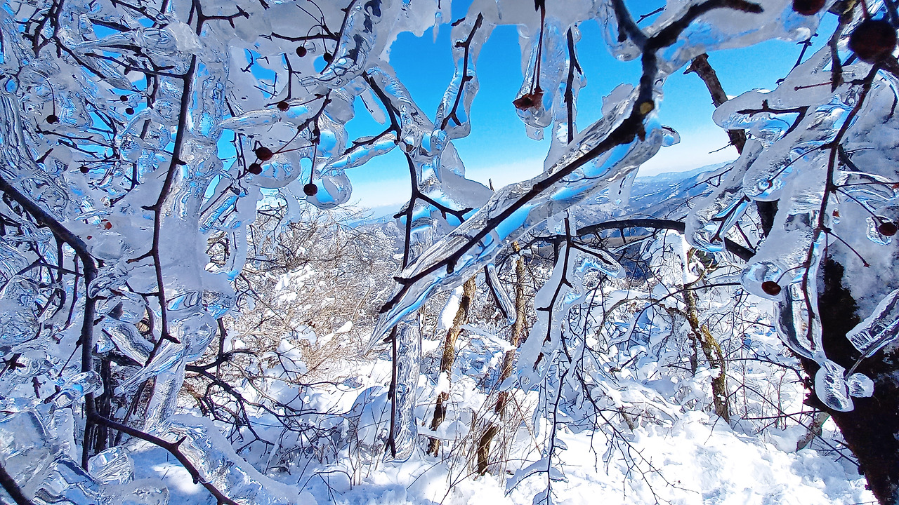 하늘을 올려다보니 빙화(얼음꽃)와 파란 하늘의 어우러짐이 겨울왕국에 와 있음을 더욱 실감 나게 한다.