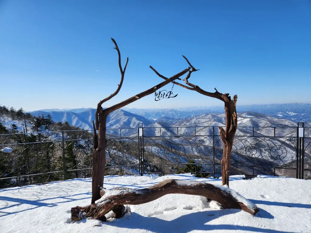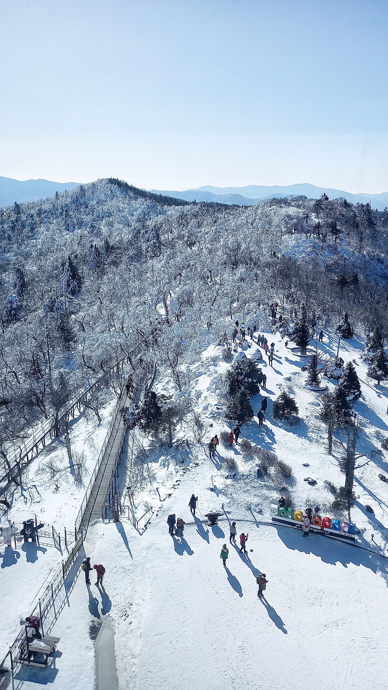 곤돌라를 타는데 거의 40여 분 기다려서 약 20여 분 정도 곤돌라를 타고 올라간다. 2층 발왕산 역사관을 둘러보고, 4층 스카이워크로 올라가서 발왕산과 주변 조망을 한다. 눈이 내려서 사방팔방이 희끗희끗하다. 어디가 어디인지 잘은 모르지만 굽이굽이 산 봉우리와 능선들이 멋지다.