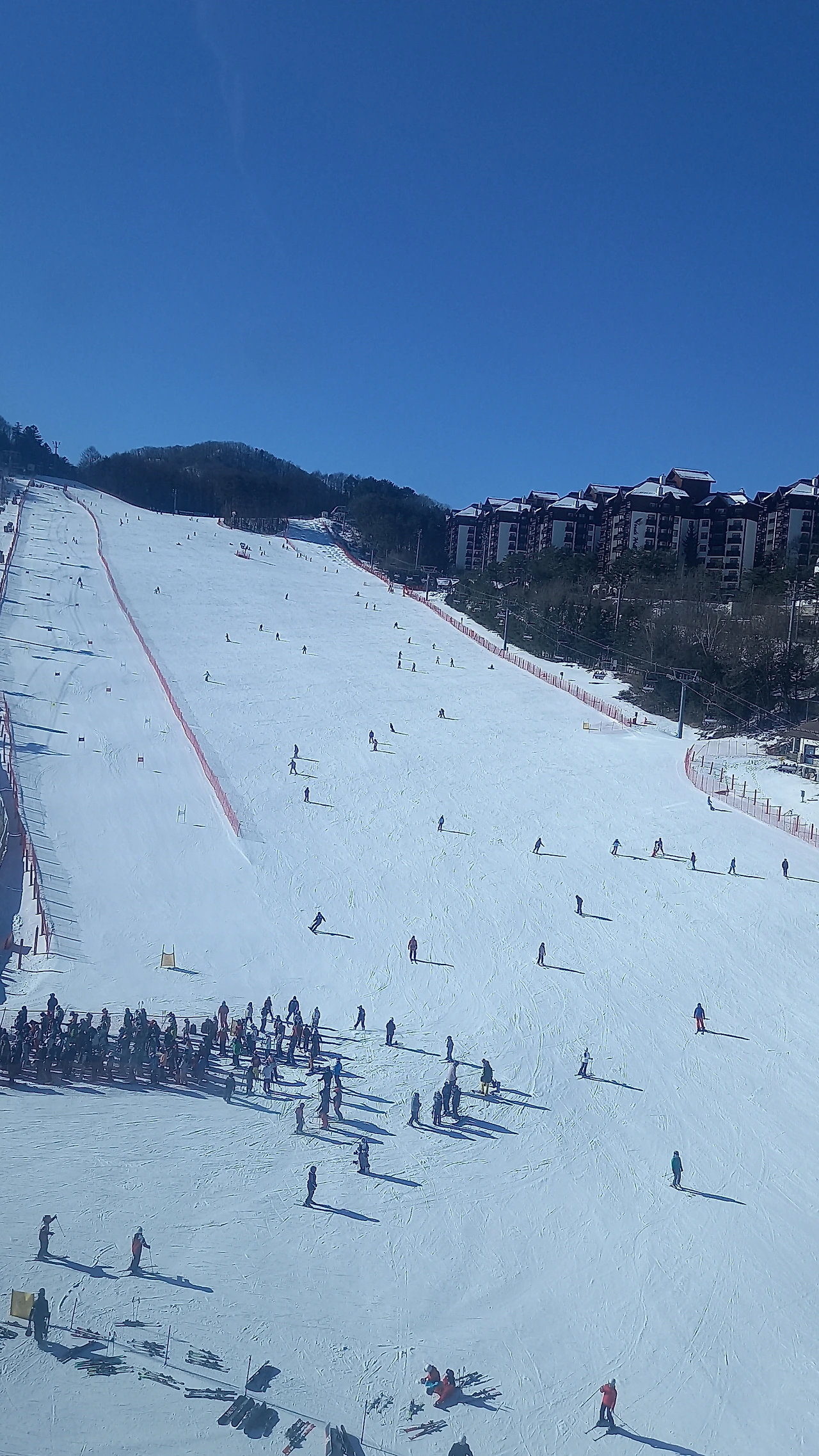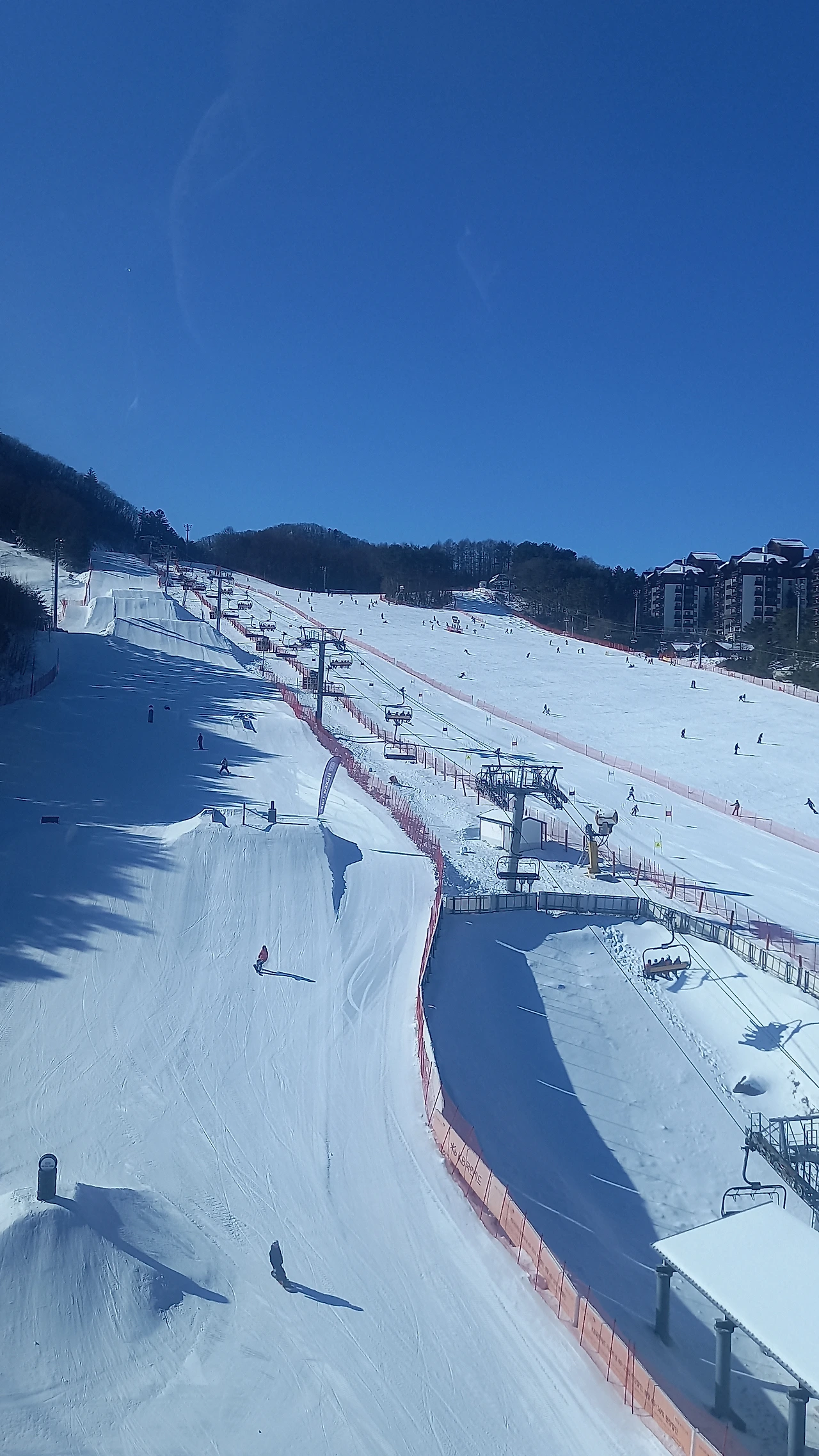 내려갈 때는 곤돌라가 한가하다. 곤돌라 안에서 구불구불한 경사진 길에서 스키 타는 이들을 내려다보면서 가는데 아찔하다. 대체로 젊은이들이 많고 어린아이들도 있다. 속도감을 즐기는 이들이 부럽다기보다는 무섭다는 생각이다.