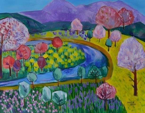 나의 그림 <봄의 생기> (서순오, 30호, 아크릴화)는 여러 산행지에서 본 봄산 느낌을 담아 그려보았다. 졸졸졸 강이 흐른다. 아직 잔설이 남아있는 산 능선은 신비로운 빛으로 칠해진다. 곤충과 벌레와 들짐승들이 눈을 뜬다. 천지개벽이다! 30호 화폭에 담기에는 너무 큰 세계이다.