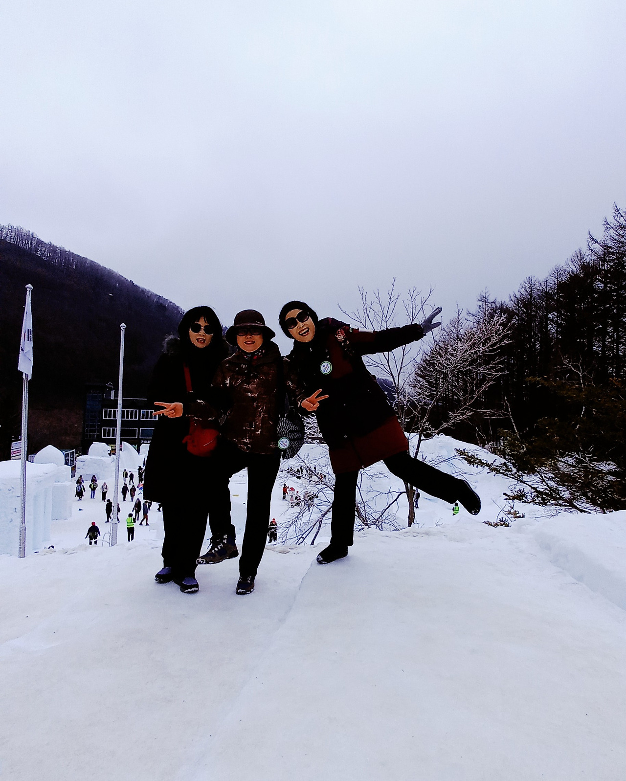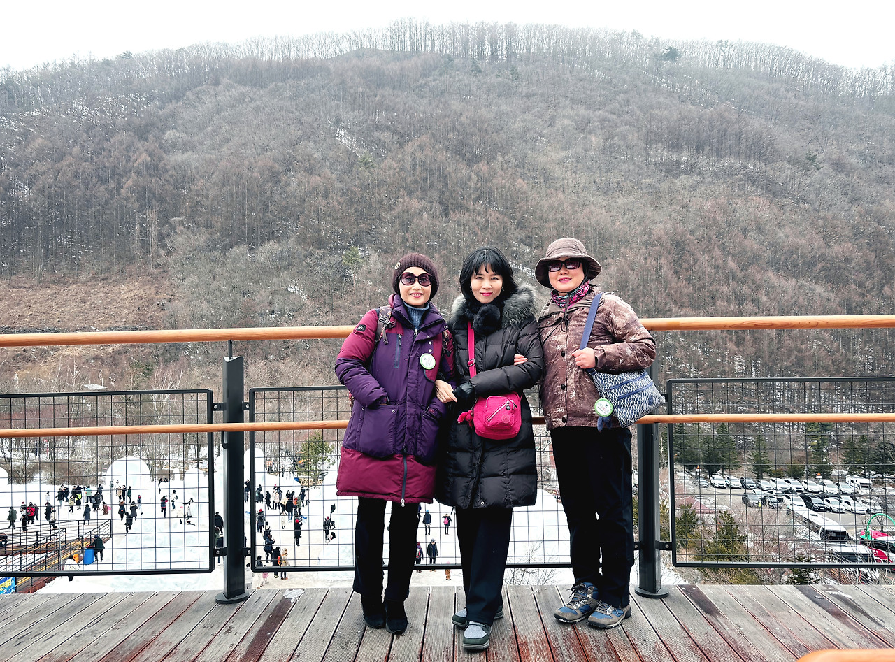 제일 위쪽에 있는 곳으로 오르는 길에 나무 한 그루에 눈꽃이 예쁘게 피었다. 눈꽃 사이로 중간 쪽 눈축제장을 배경으로 셋이서 사진을 찍는다. 사진 찍어준 여자분이 그런다.