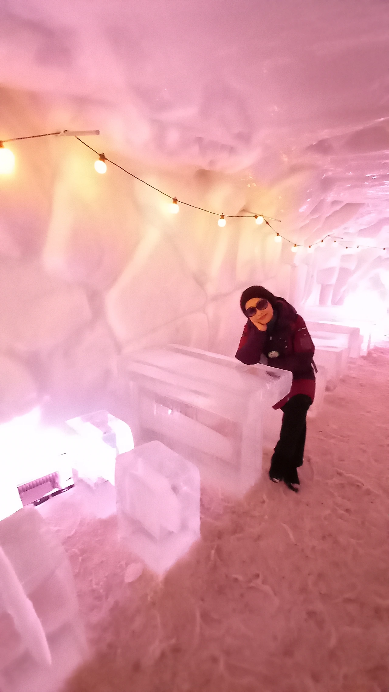 당골광장에서 태백산으로 오르는 길 초입에 이글루 카페가 있어서 들어가 본다. 입구에 에스키모인과 눈사람, 이글루 카페 안에도 눈사람, 얼음테이블과 얼음의자, 빛이 조화를 이룬 얼음 장식들이 신비로운 동굴 같다.