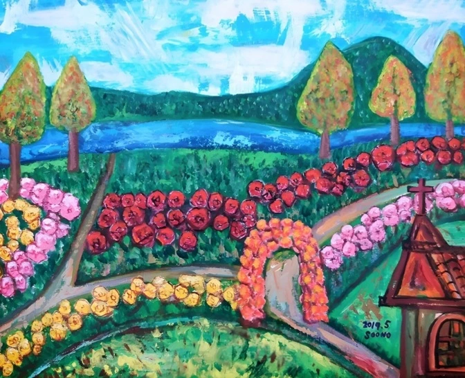 그래서 나는 그림으로나마 내가 살면서 예배하고 싶은 전원교회를 그려보았다. 그러고 보니까 곡성 섬진강 기차마을에서 본 장미정원이 떠오른다. 장미꽃이 만발한 교회의 정원 아치문을 나가면 강으로 갈 수가 있다. 강가에는 수선화나 코스모스를 심어도 좋으리라. 물론 그냥 초록풀이 무성해도 좋고 갈대가 나부껴도 좋으리라. 계절마다 다르게 가장 예쁜 꽃들이 피어나리라. 눈이 부시게 파란 하늘에는 흰구름이 뭉클뭉클 피어나서 온 하늘을 덮어도 좋으리라. 구름빵, 구름기차, 구름비행기도 만들면서 맘껏 떠다니리라.
